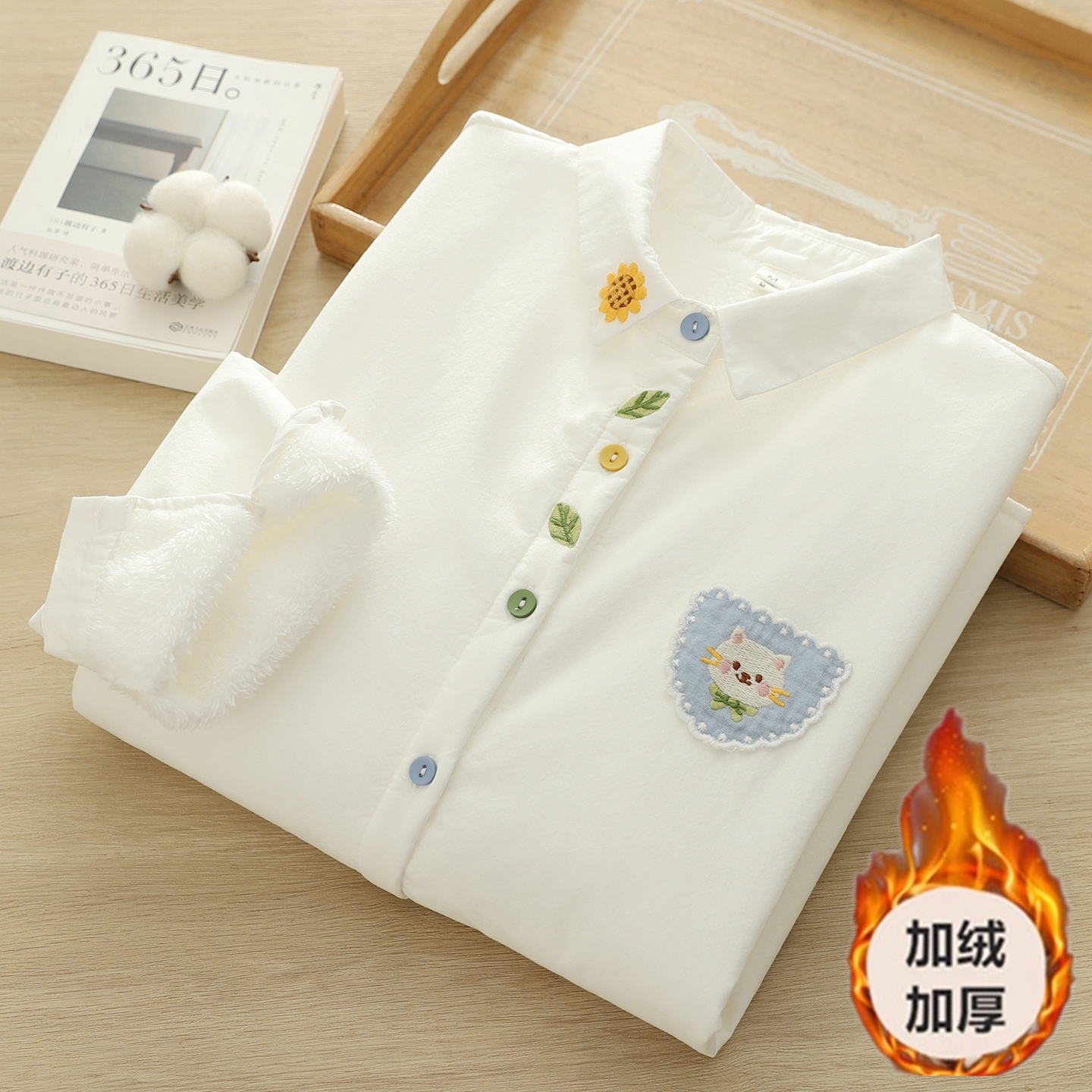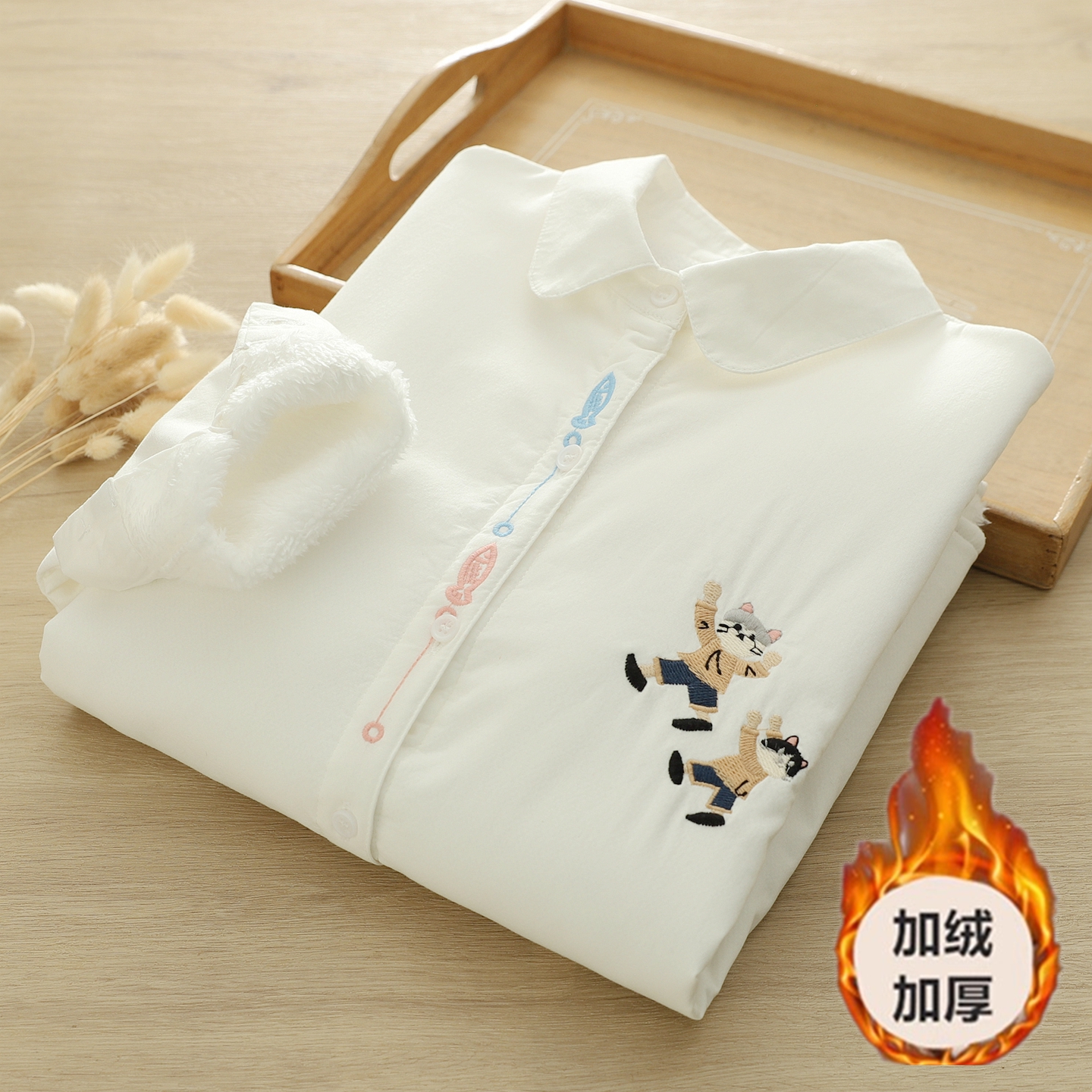 2025冬季文艺小清新卡通刺绣猫咪纯棉加绒加厚白衬衫女长袖打底衫