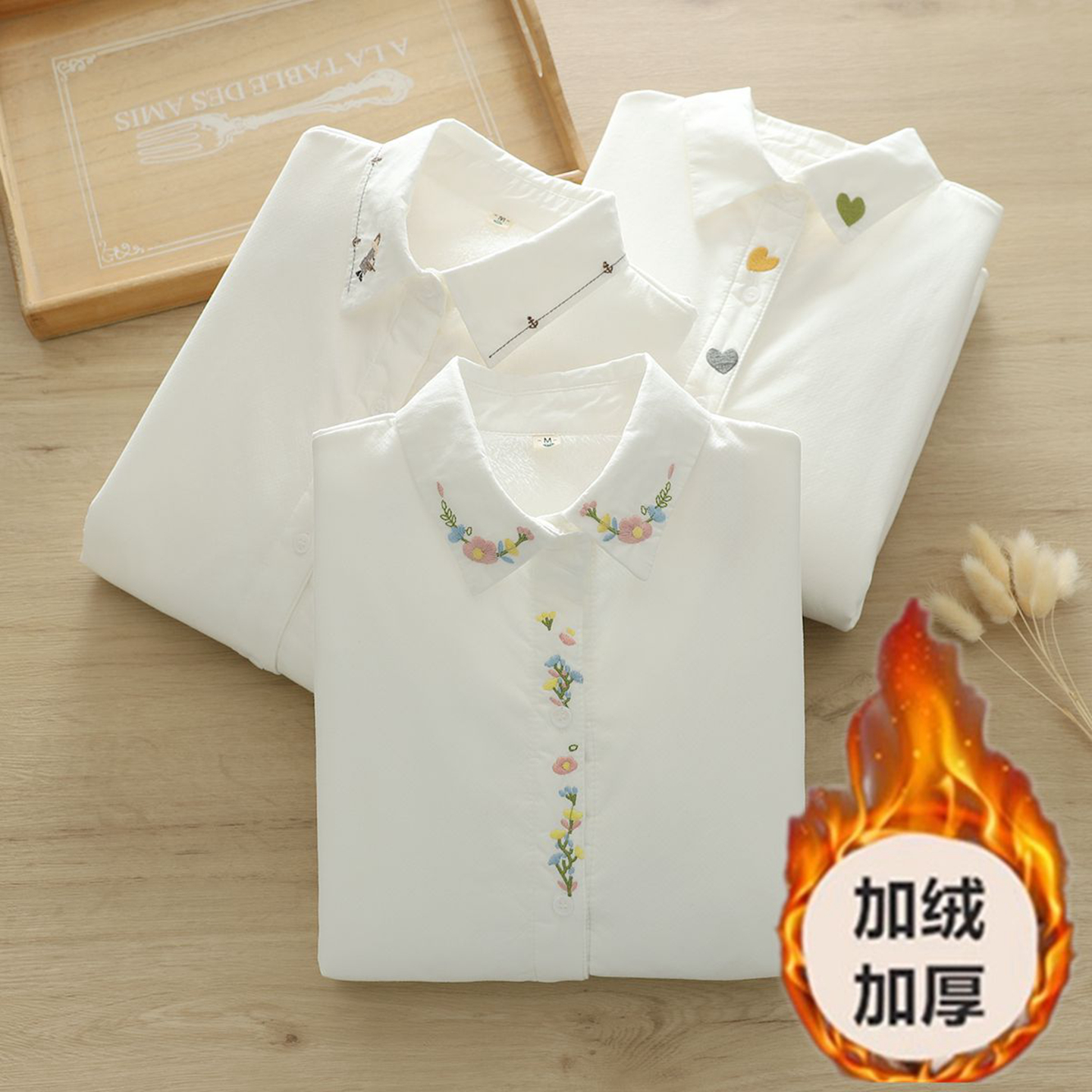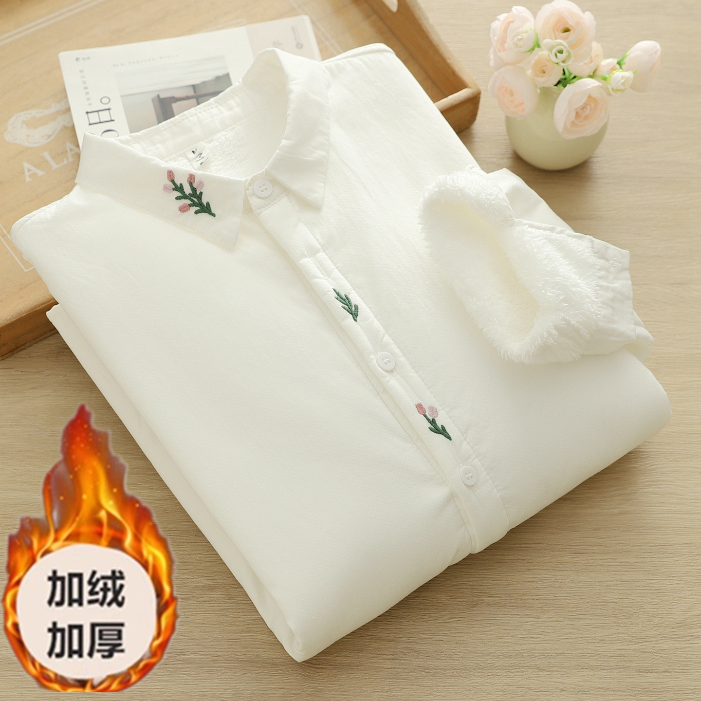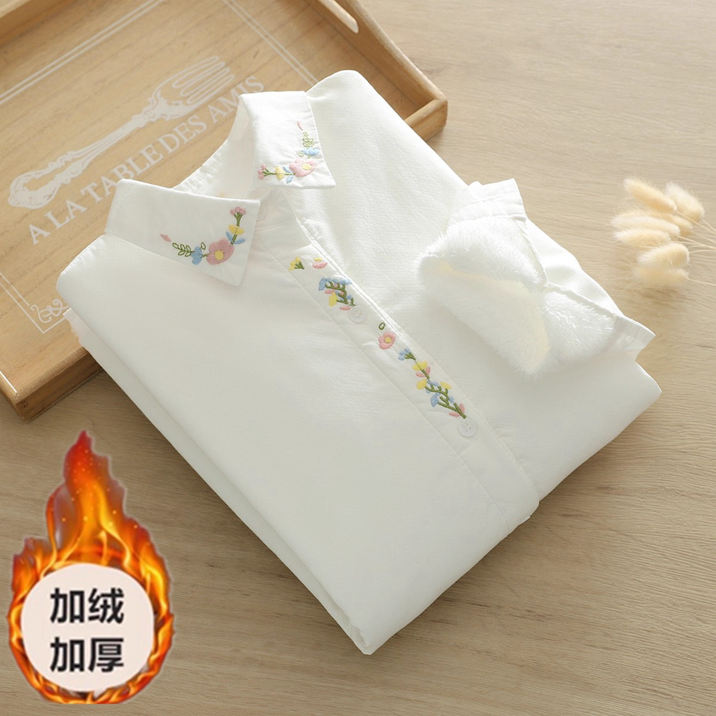 2025冬季文艺小清新刺绣野花纯棉加绒加厚白衬衫女长袖打底衫叠穿