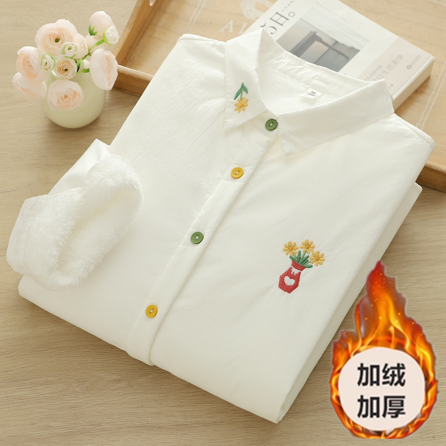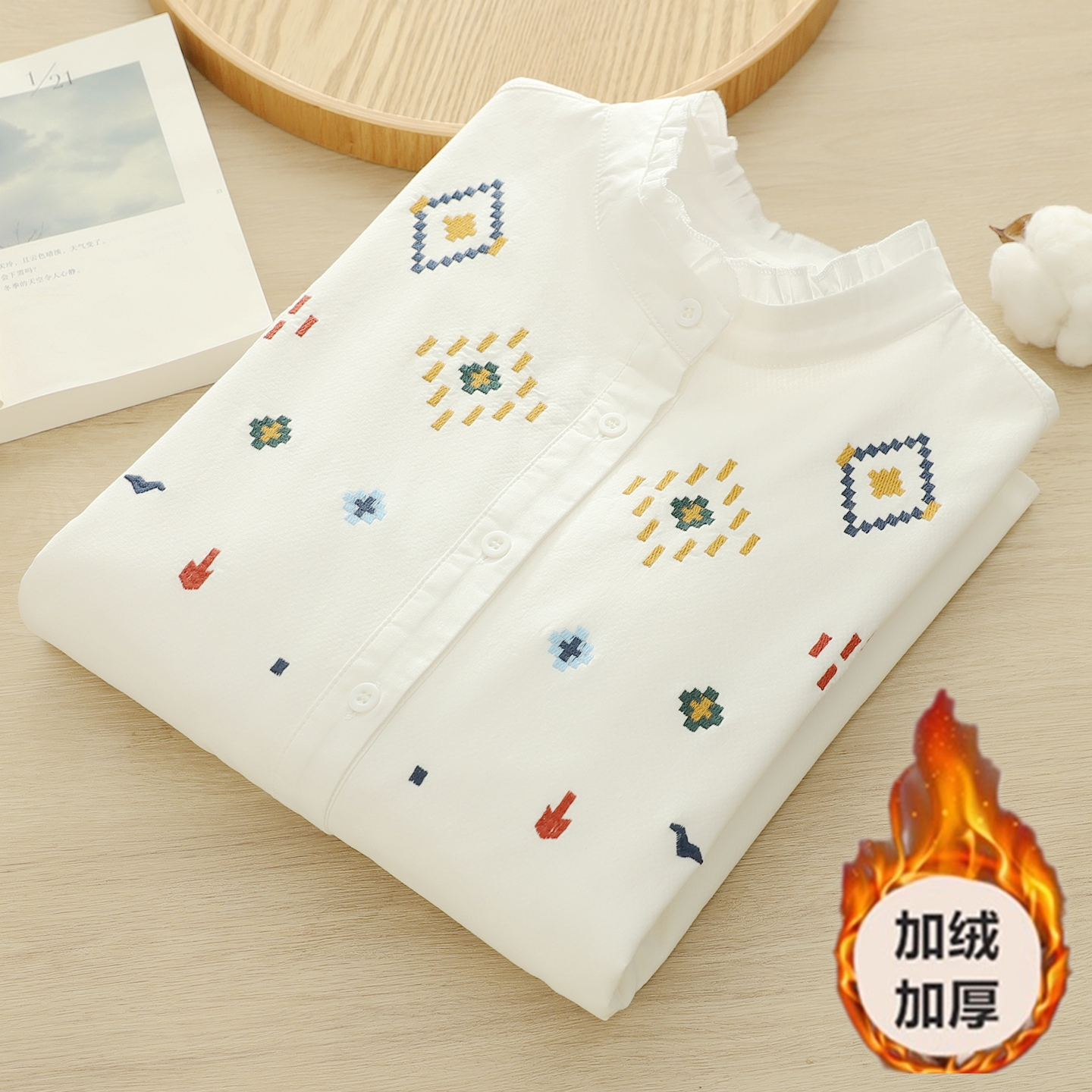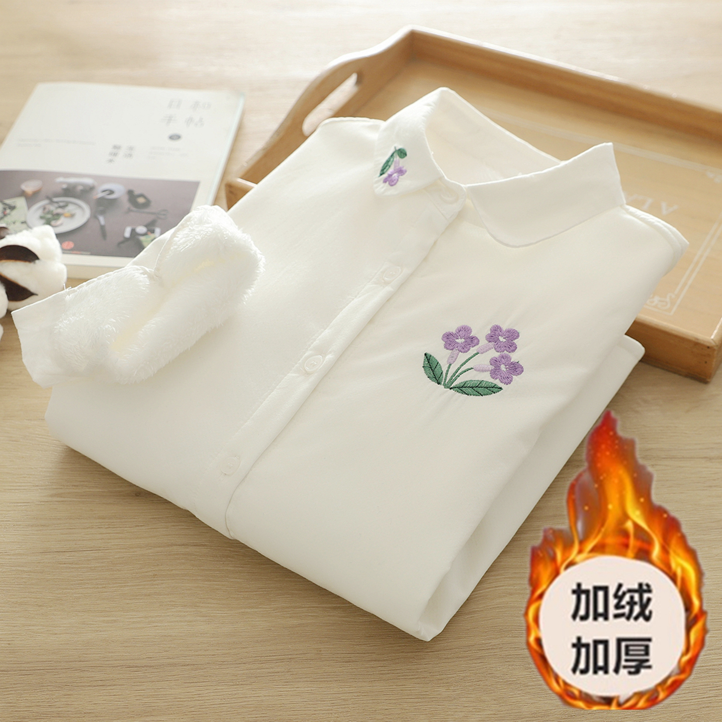 2025冬季文艺小清新刺绣野花纯棉加绒加厚白衬衫女长袖打底衫叠穿