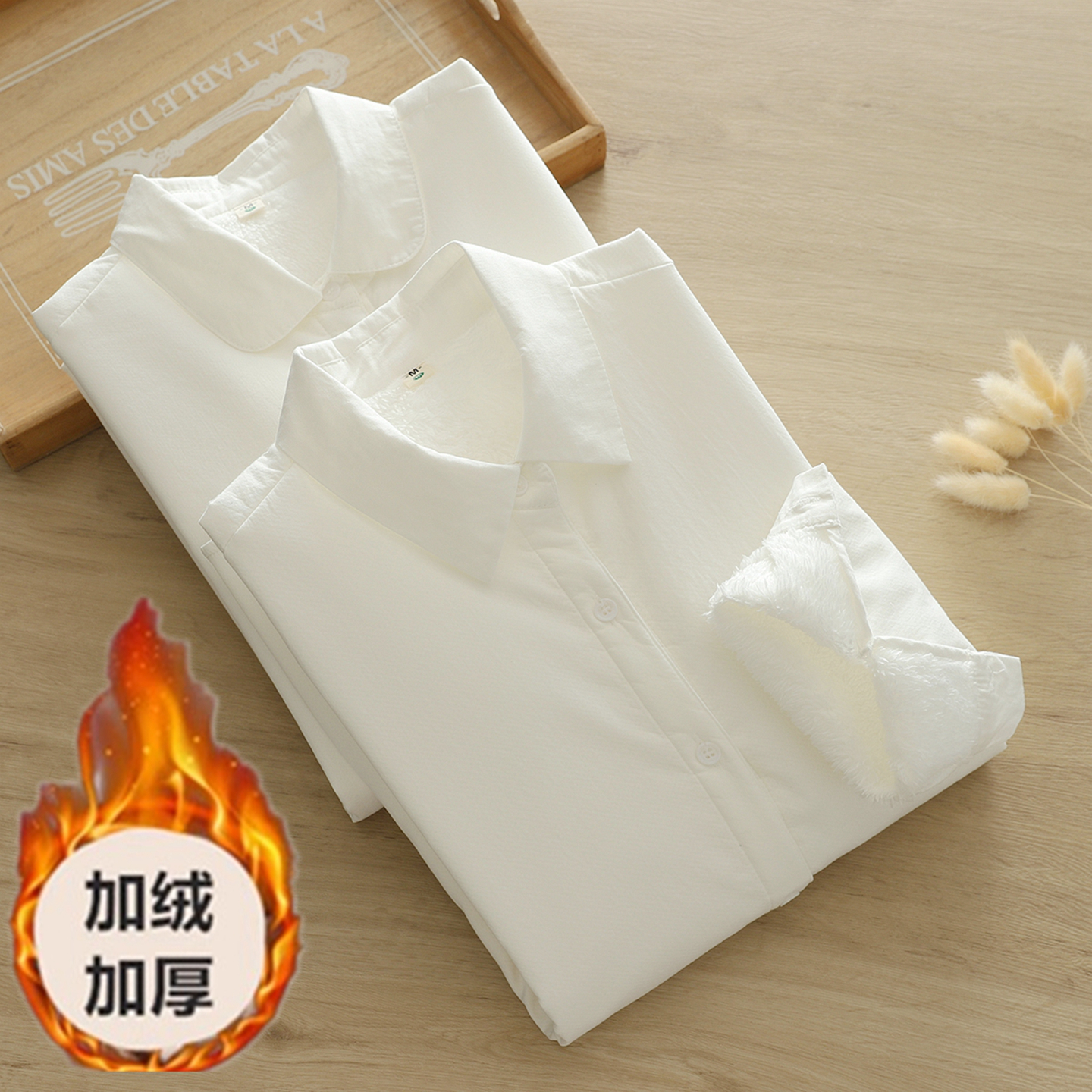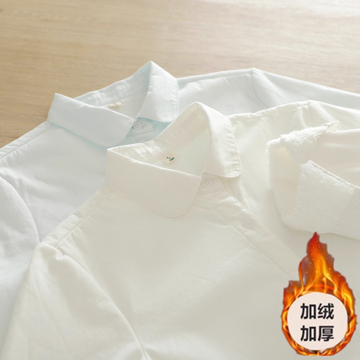 2025冬季文艺小清新娃娃领纯色纯棉加绒加厚白衬衫女长袖打底衫潮