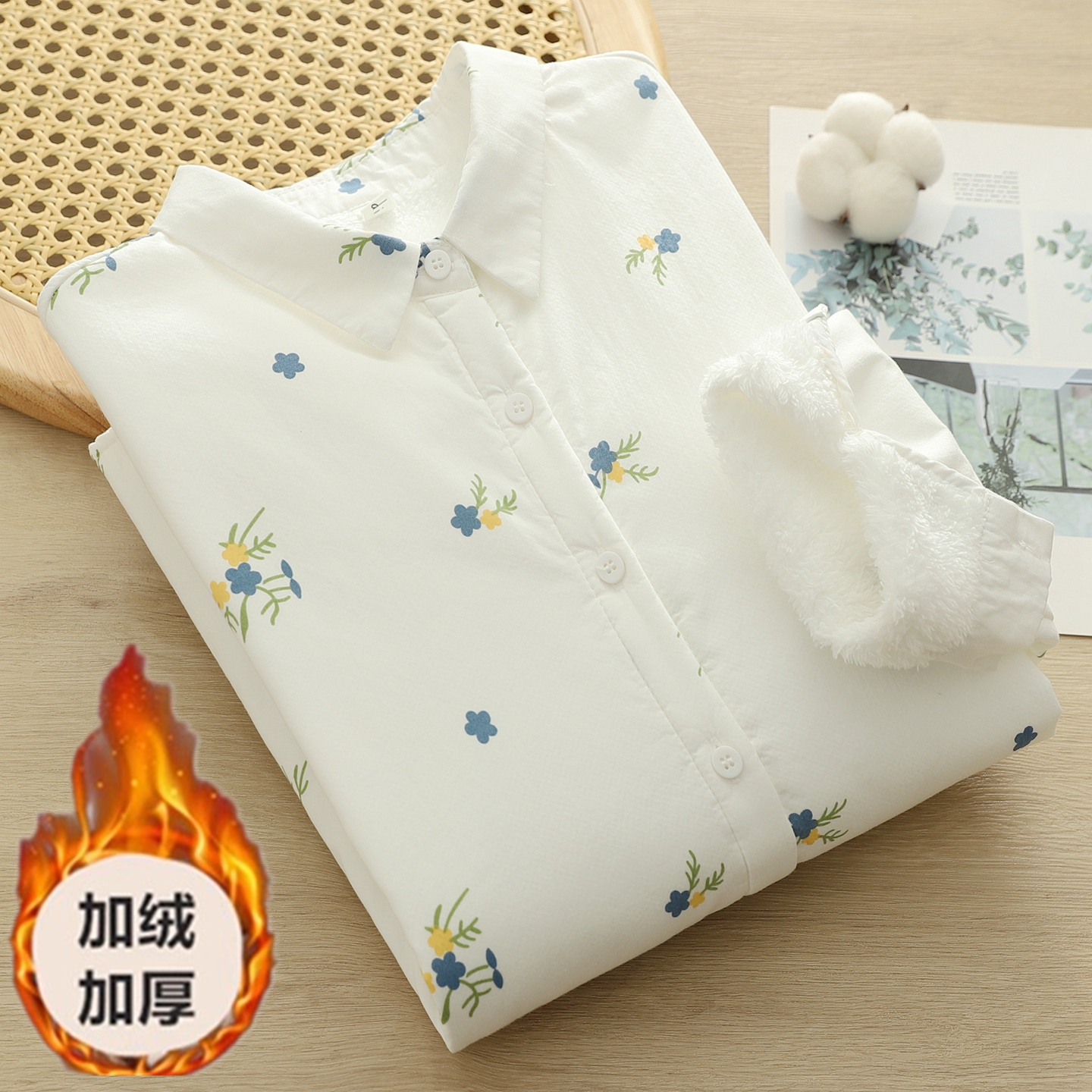 2025冬季文艺小清新卡通兰花纯棉加绒加厚白衬衫女长袖打底衫学生