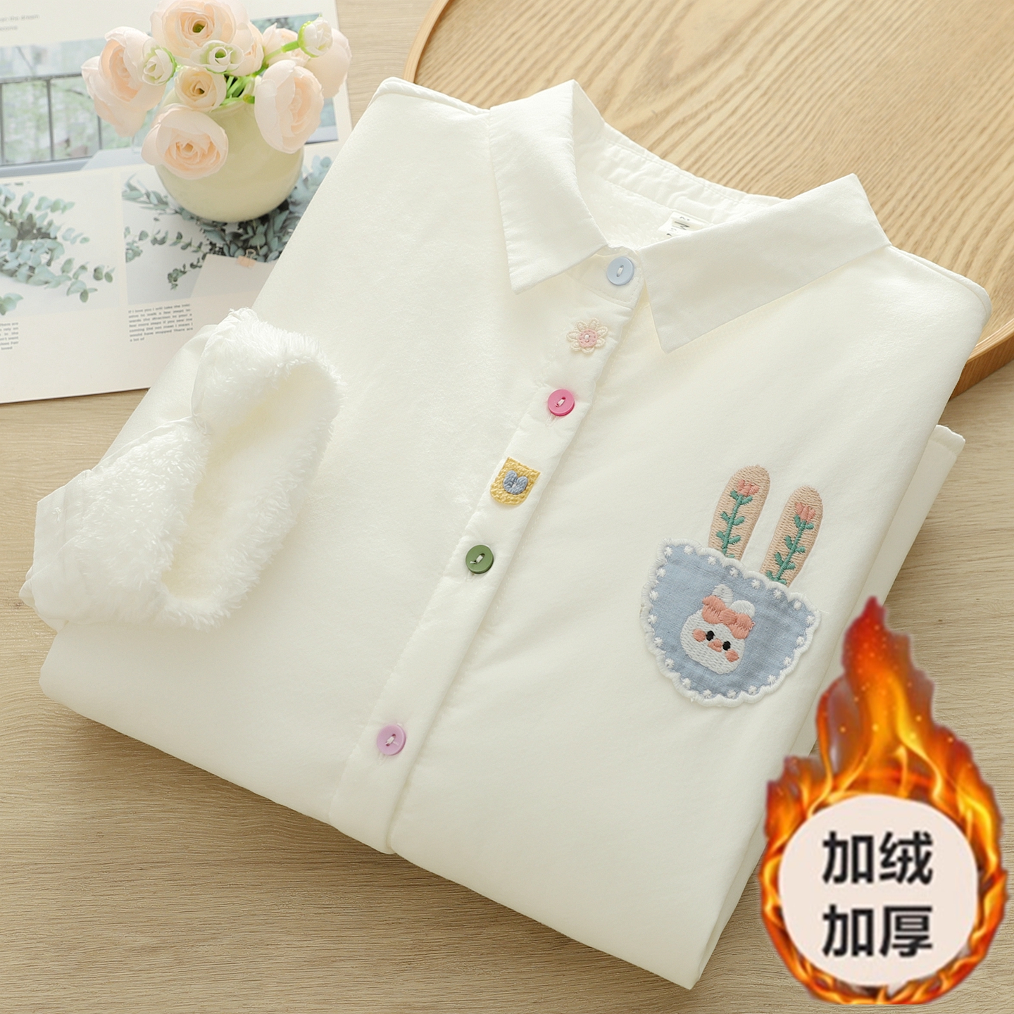 2025冬季文艺小清新刺绣兔子彩扣纯棉加绒加厚白衬衫女长袖打底衫