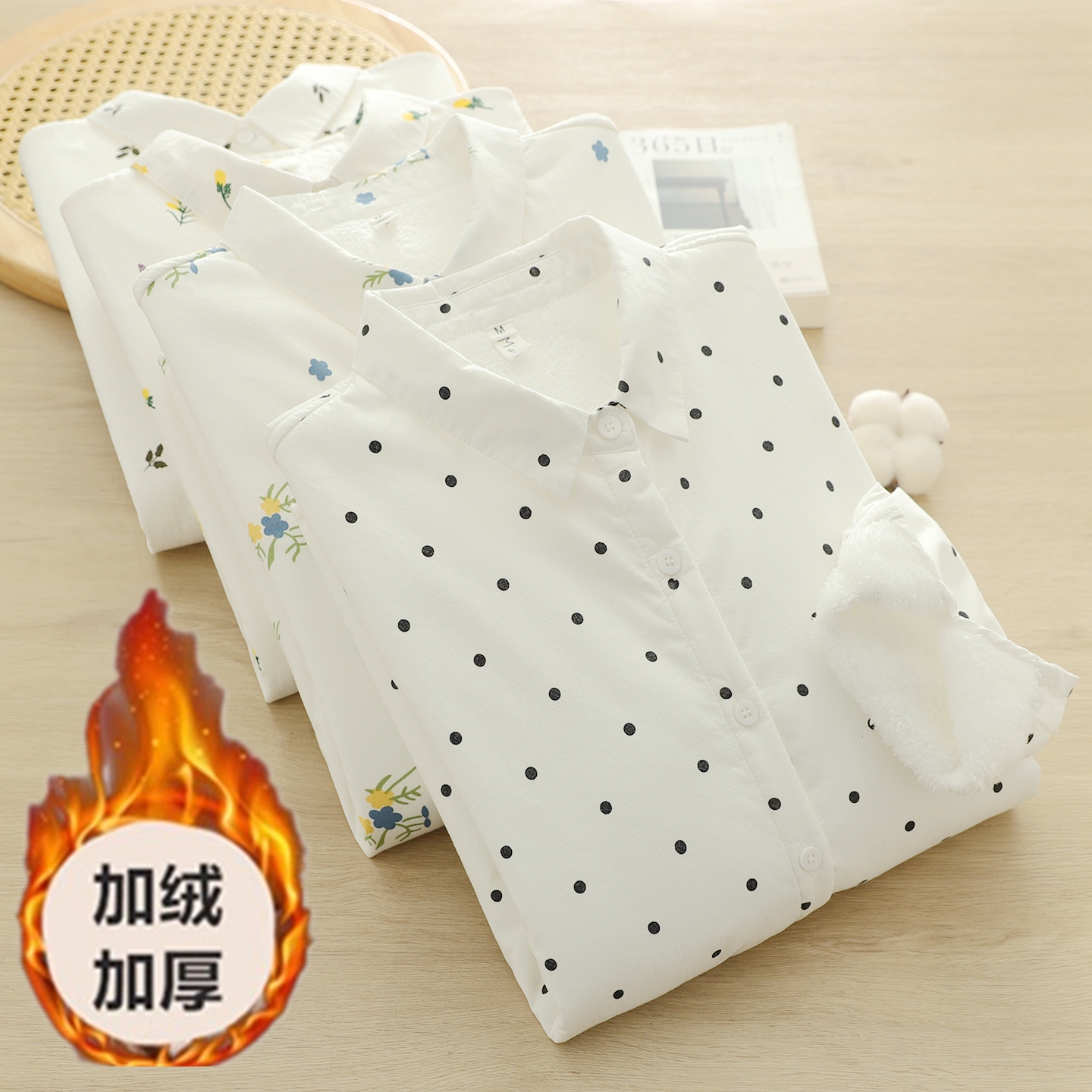 2025冬季文艺小清新卡通波点薰衣草纯棉加绒加厚白衬衫女长袖学生
