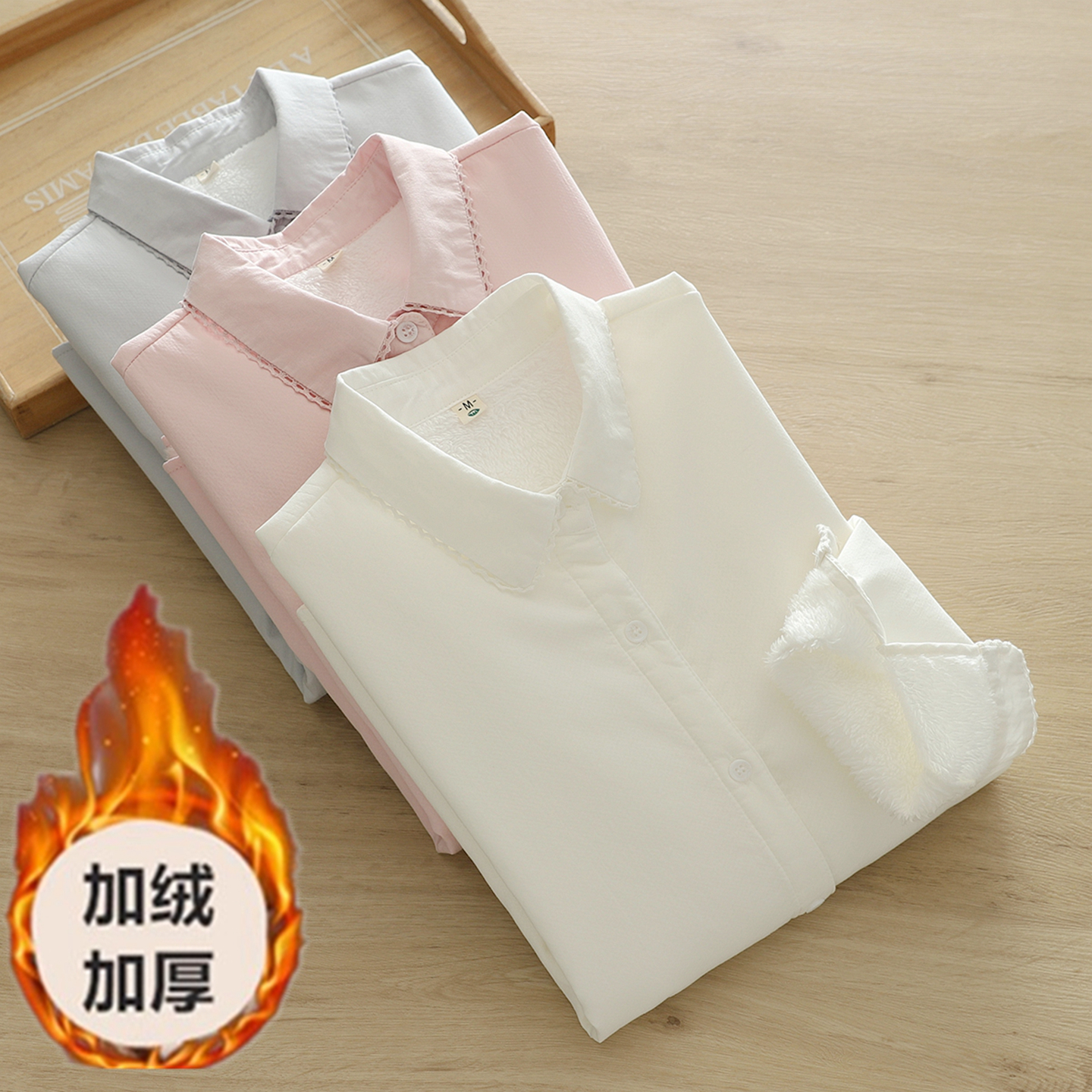 秋冬新款文艺百搭加绒加厚白衬衫女生长袖职业学院风保暖打底衬衣