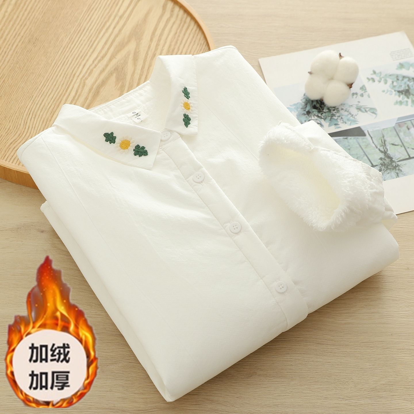 2025冬季文艺小清新刺绣太阳花纯棉加绒加厚白衬衫女长袖打底衫潮