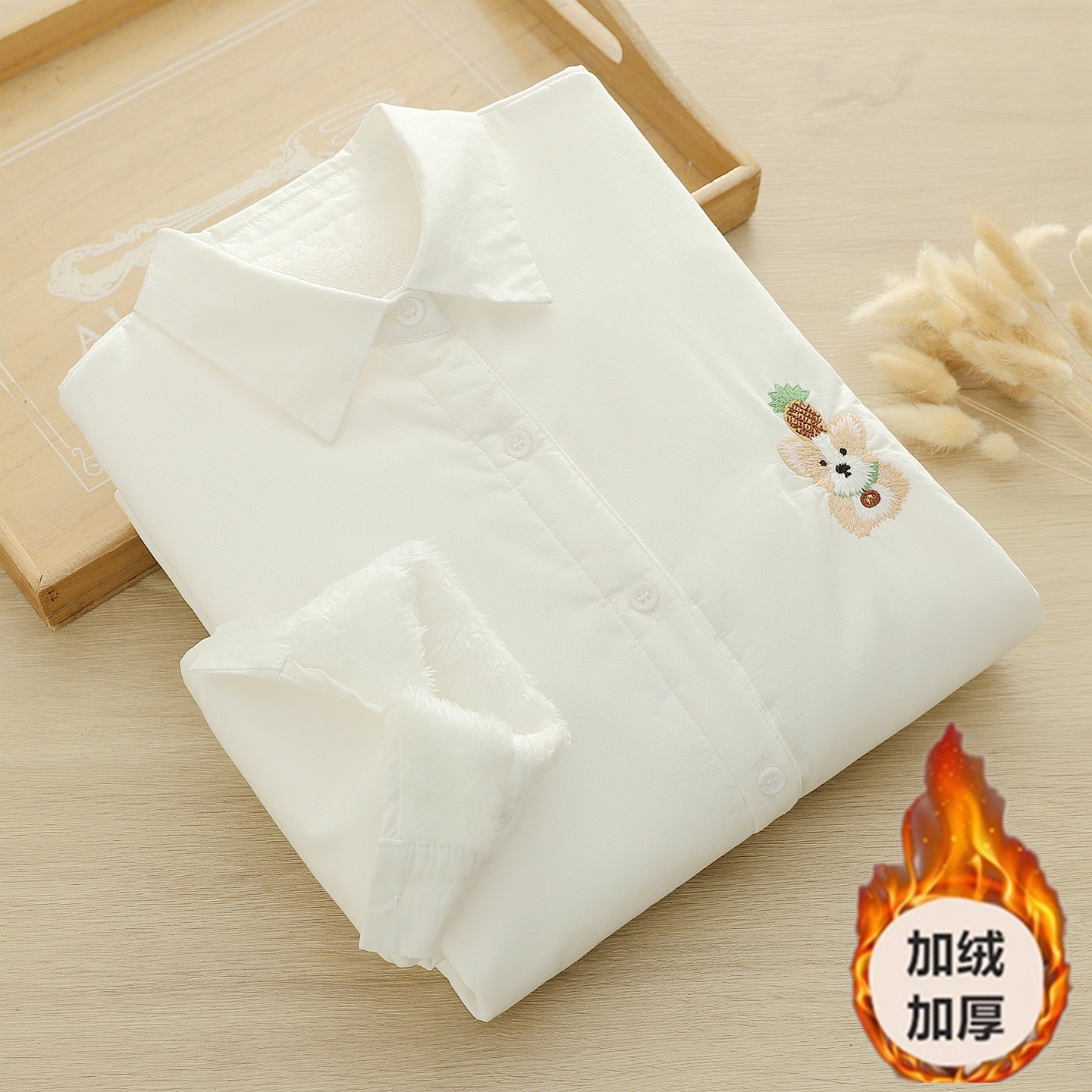 2025冬季文艺小清新卡通刺绣菠萝柯基狗纯棉加绒加厚白衬衫女长袖