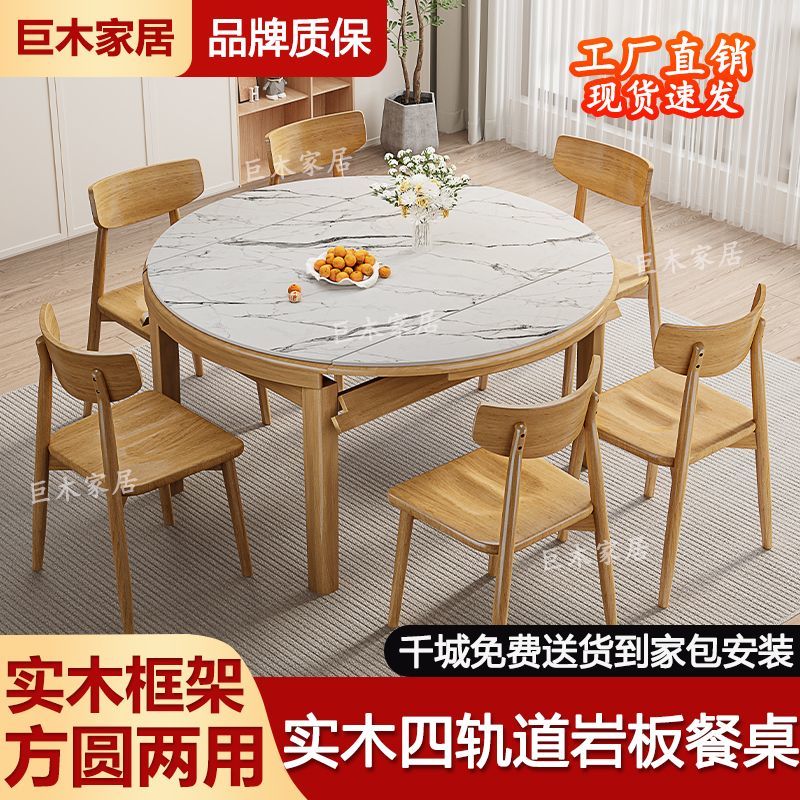 实木四轨道岩板餐桌椅组合家用小户型客厅饭桌方圆两用可伸缩折叠