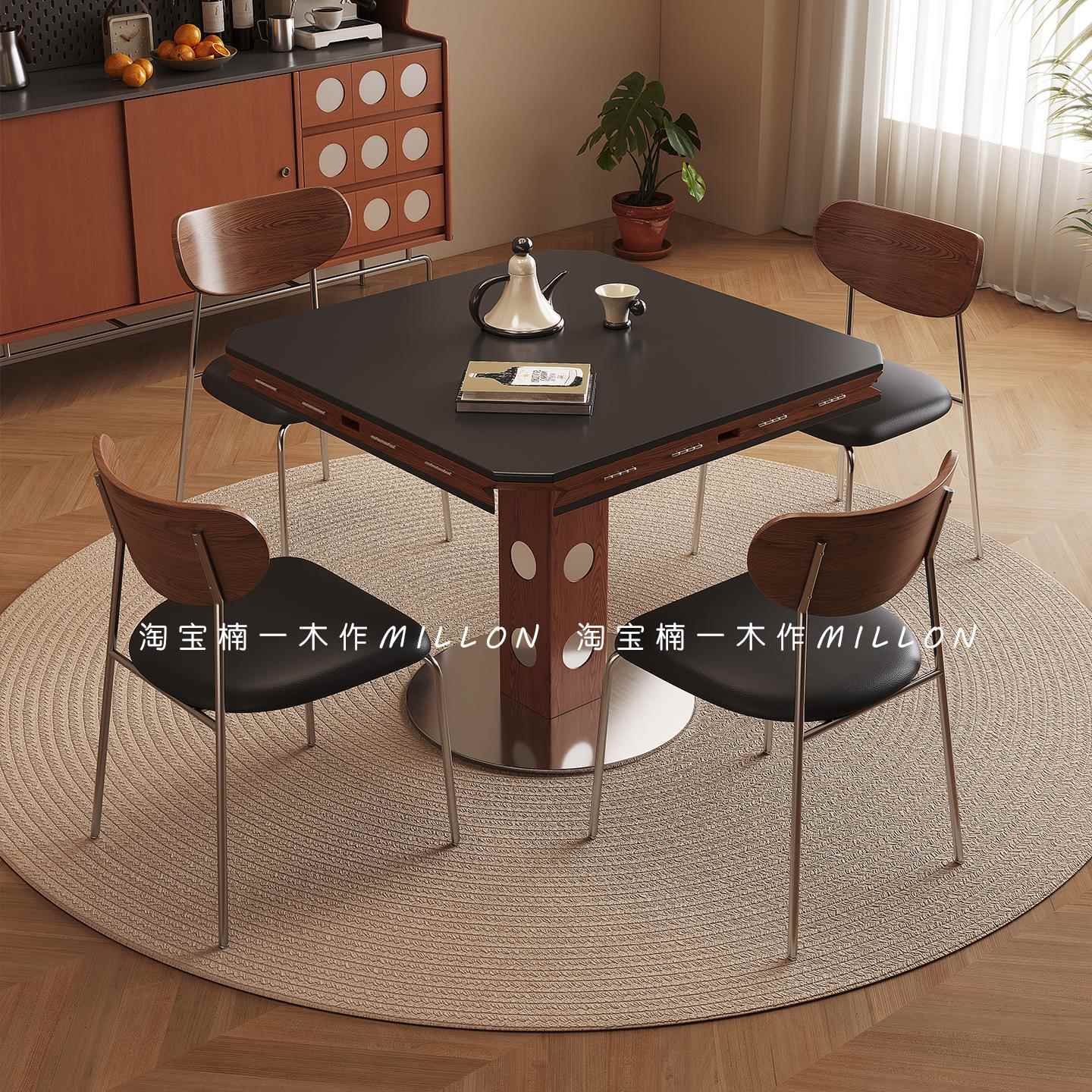 中古风岩板餐桌椅组合简约家用小户型方圆两用复古圆形四折叠餐桌