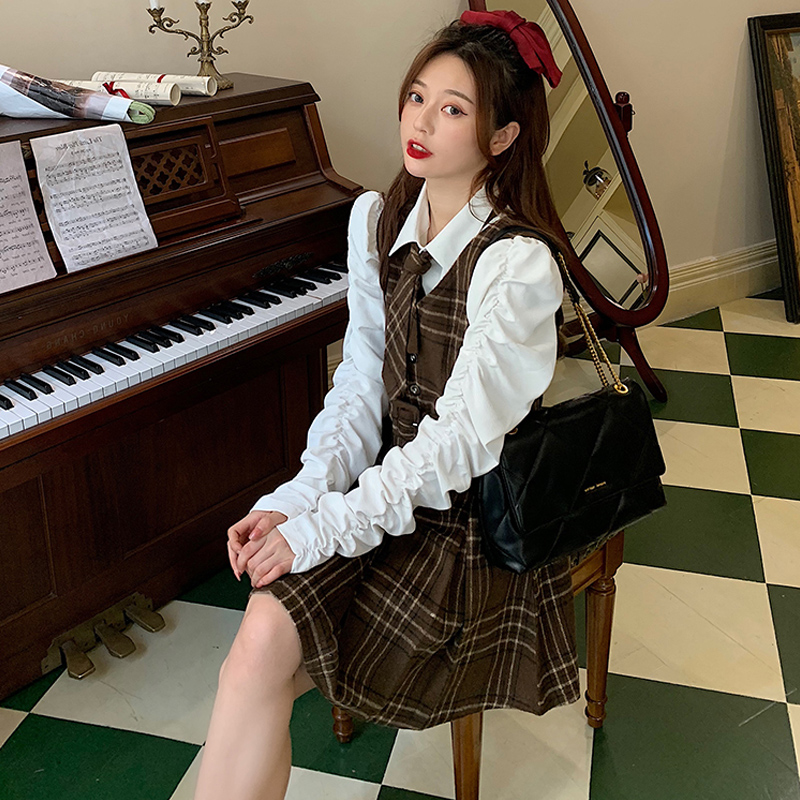 大码女装胖妹妹显瘦衬衫格纹学院风收腰百褶背心连衣裙套装秋冬款