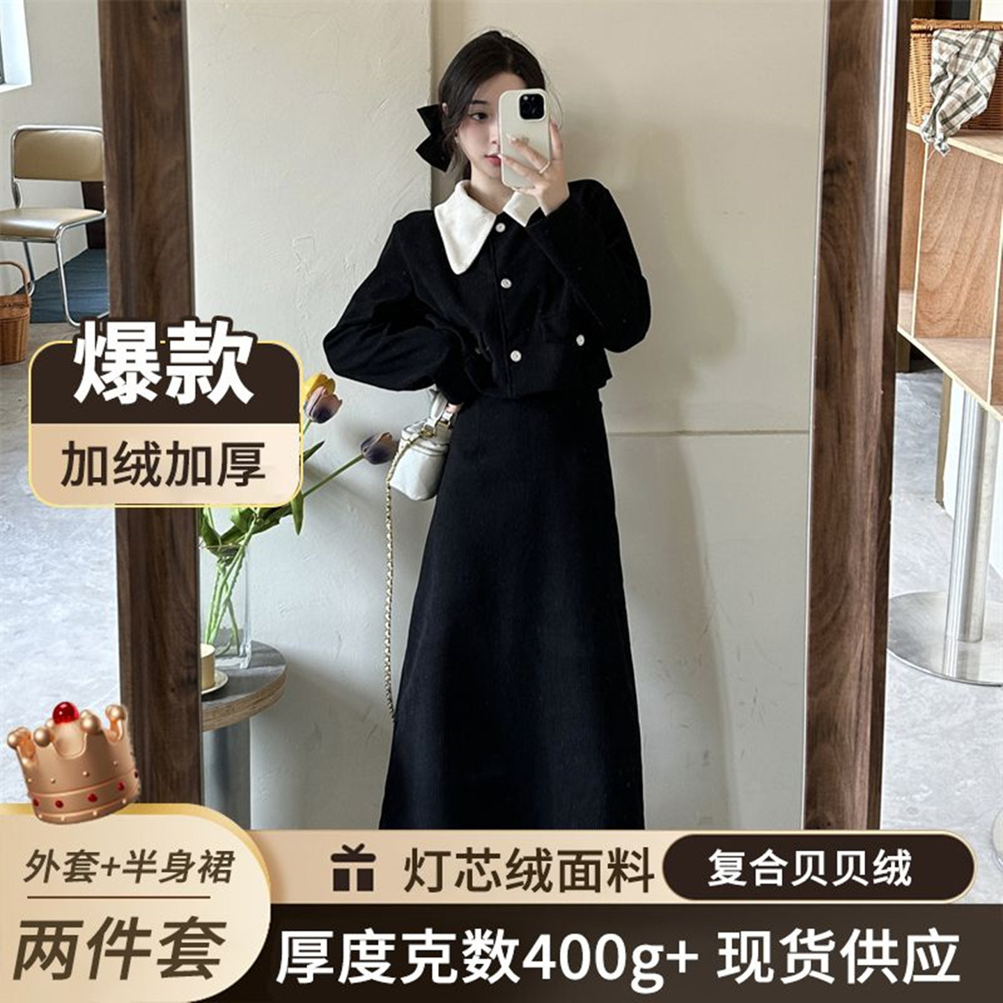 小香风气质灯芯绒套装女秋冬款大码加绒翻领外套高腰半身裙两件套