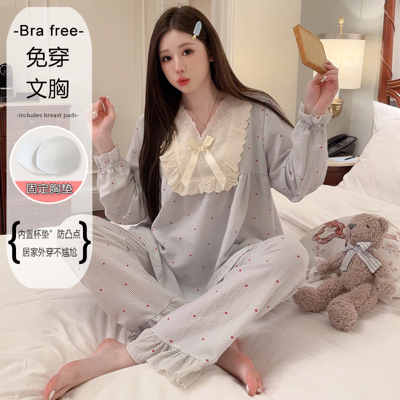睡衣女春秋季长袖V领甜美可爱蝴蝶结大码公主款家居服秋冬款套装