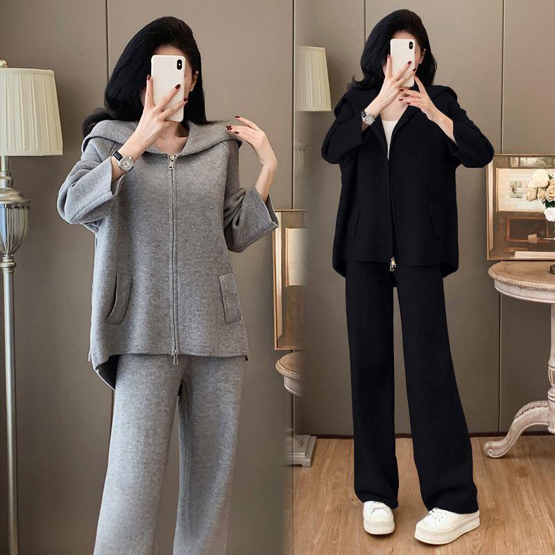 秋冬款流行休闲套装大码女装洋气减龄连帽针织开衫阔腿裤两件套潮