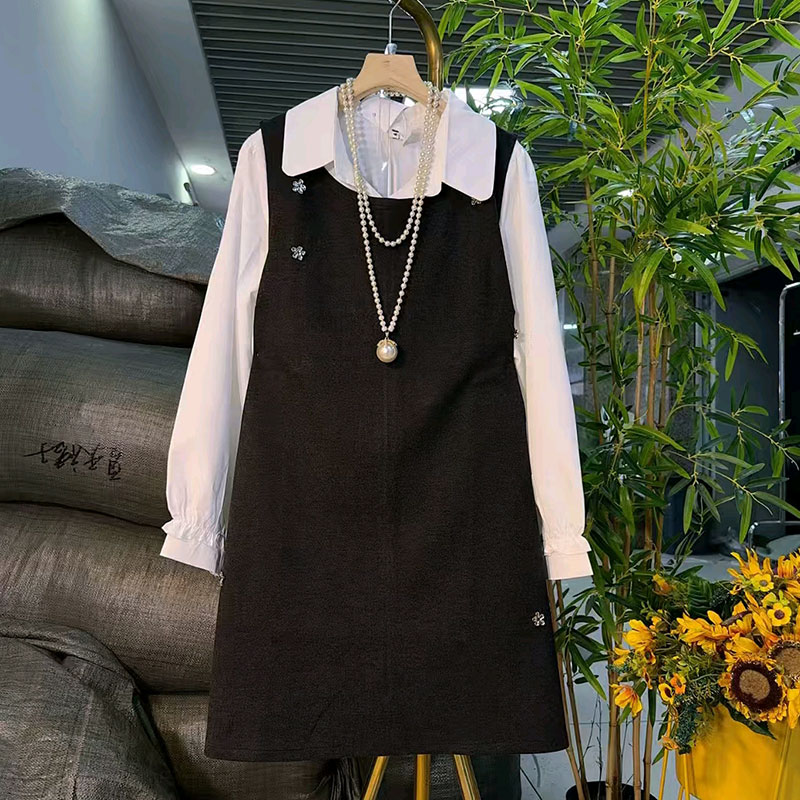 胖妹妹套装翻领长袖衬衫马甲裙加肥大码女装秋冬款通勤显瘦两件套