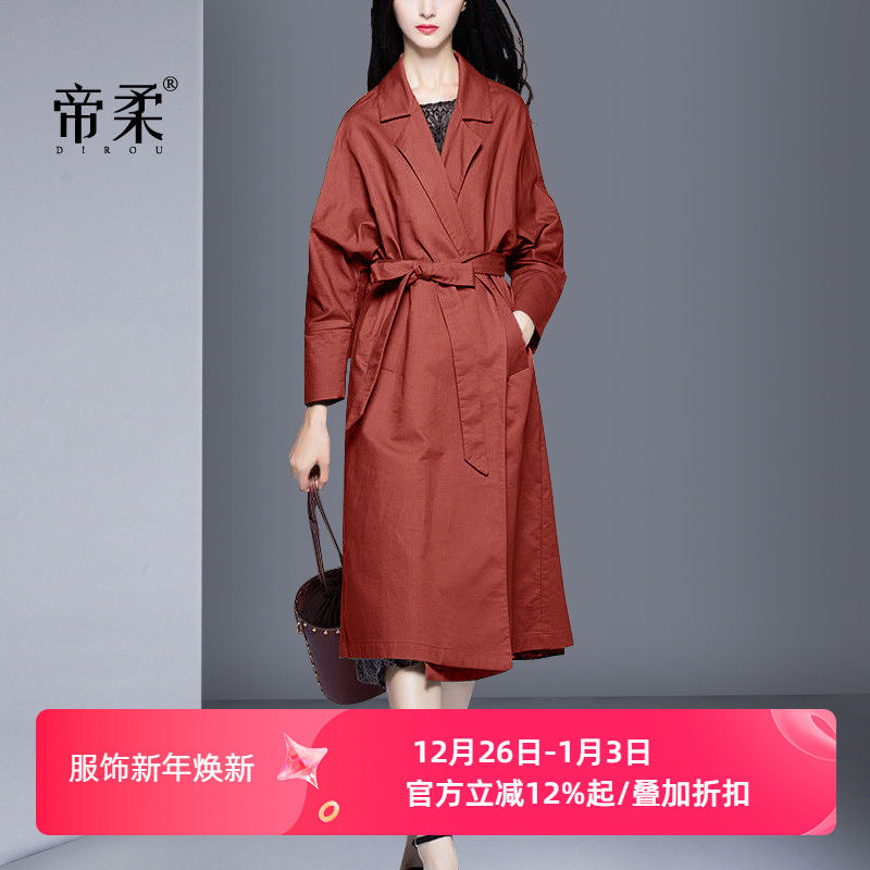 春秋季新款韩版英伦时尚气质大红风衣女中长款修身显瘦双排扣外套