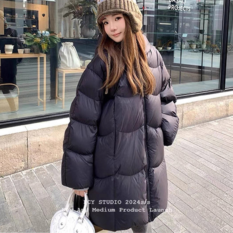 香港高级感黑色中长款连帽羽绒棉服女冬韩版宽松加厚茧型保暖外套