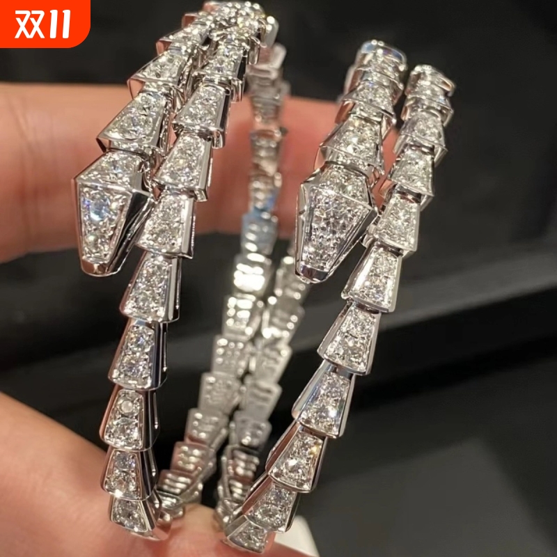 蛇形手镯女镀银18K玫瑰金满钻蛇骨蛇头简约开口手环镶钻款多圈