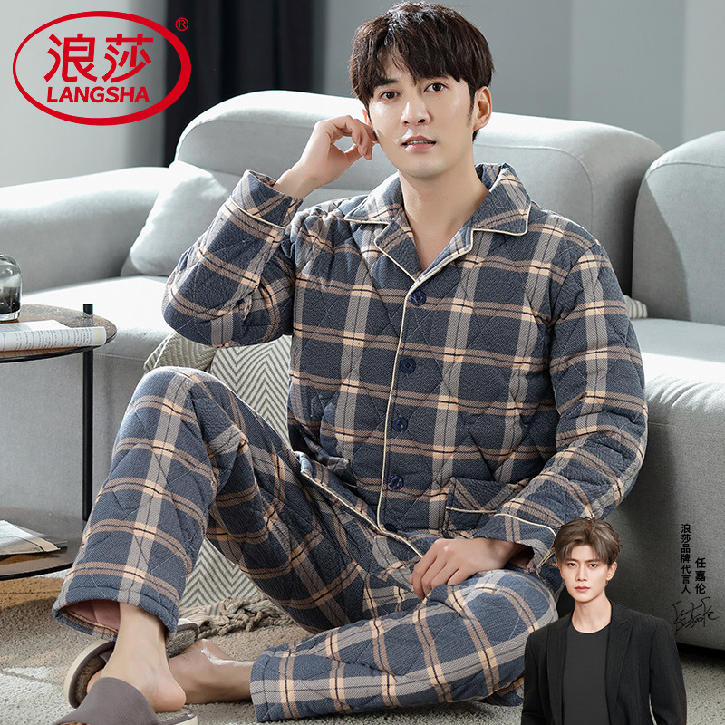 浪莎冬季睡衣男士秋冬款三层加厚纯棉夹棉家居服保暖棉袄中年套装