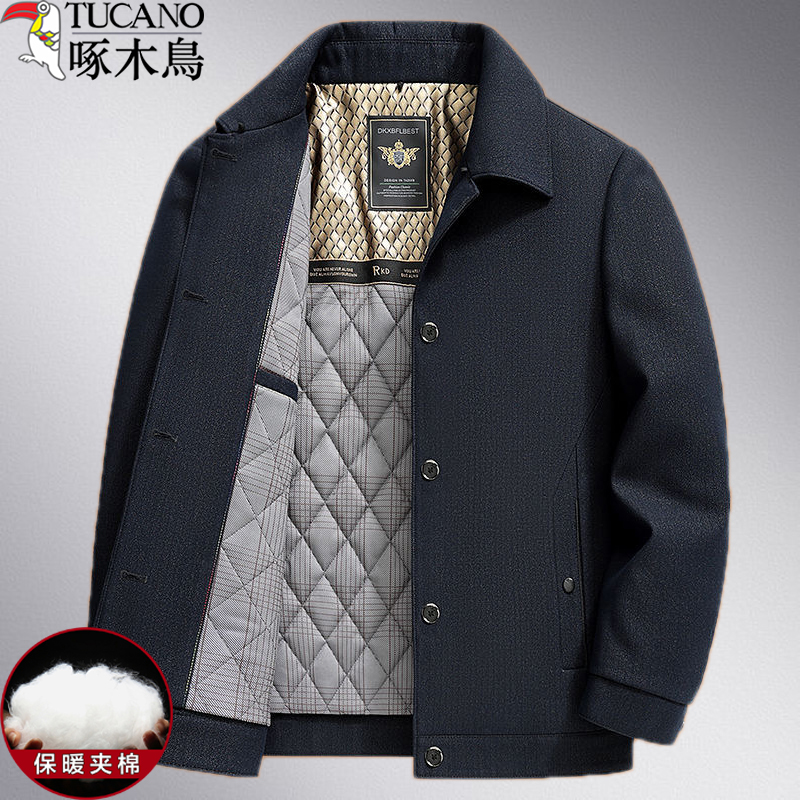 啄木鸟秋冬季男士翻领棉衣外套中老年夹克桑蚕丝中年爸爸加厚棉服