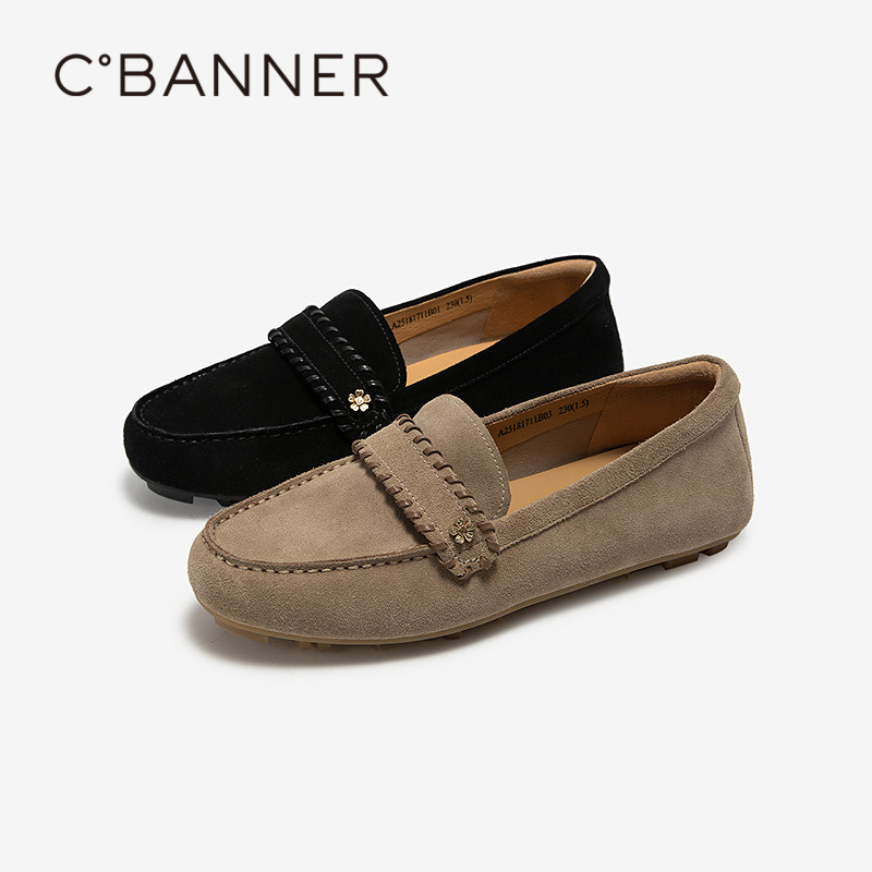 千百度薄底牛皮乐福鞋女2025春秋新款平底通勤深口单鞋轻盈豆豆鞋