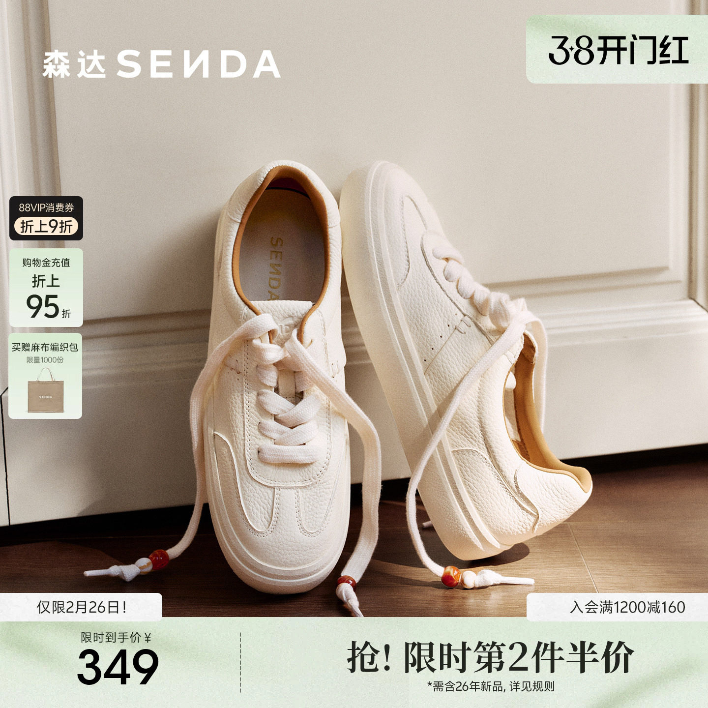 森达经典牛皮小白鞋休闲德训鞋女款26年新款真皮百搭平底运动板鞋