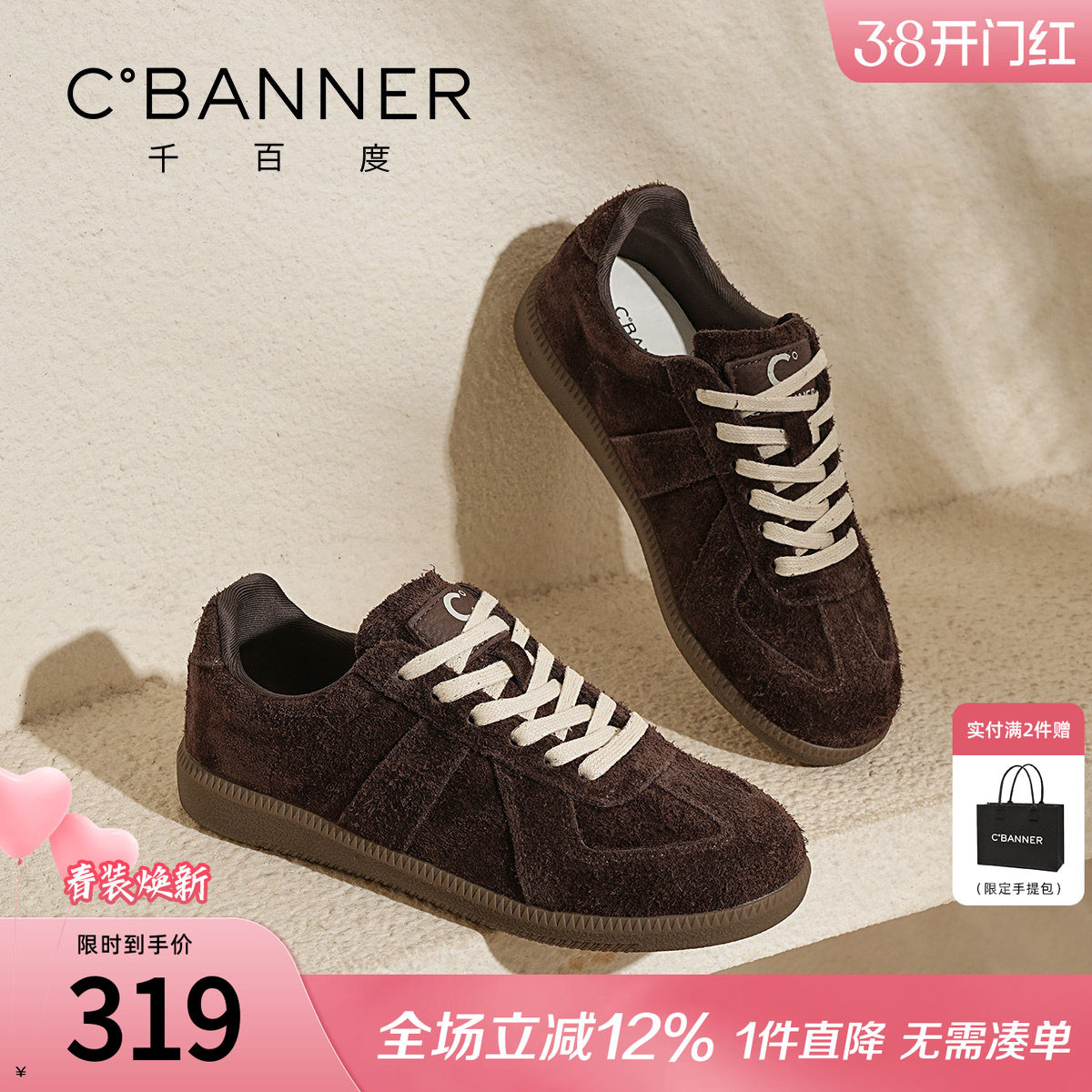 千百度厚底板鞋女新款复古小白鞋平底增高百搭真皮休闲运动德训鞋