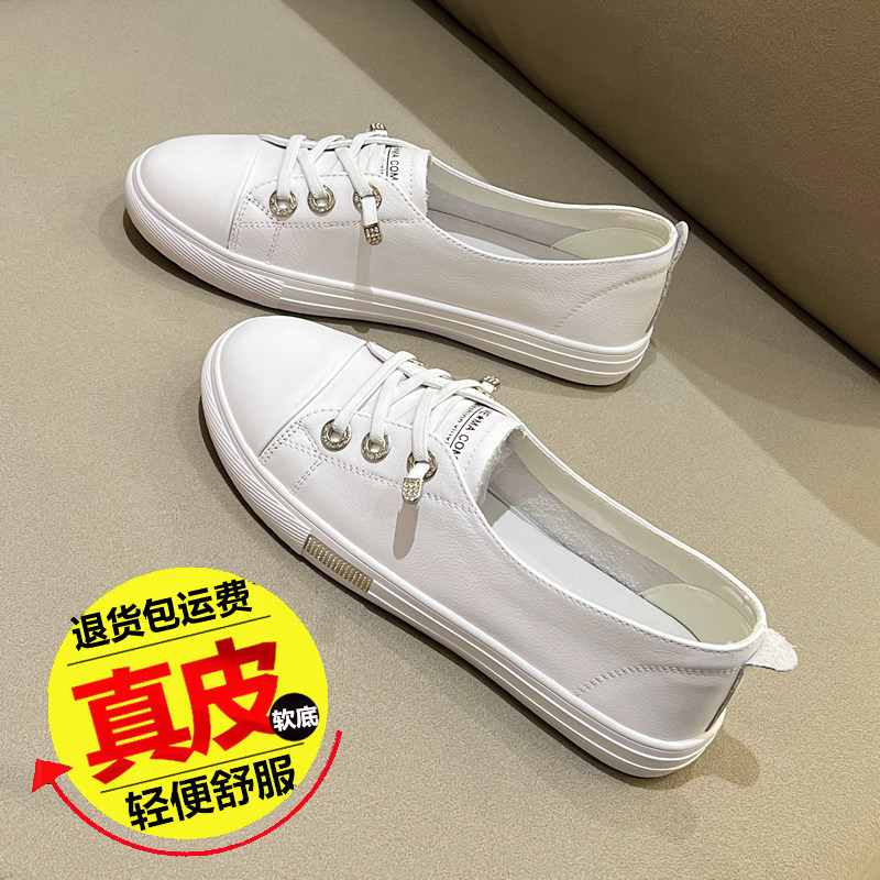 真皮平底休闲板鞋女2026春秋新款百搭舒适系带简约爆款轻便小白鞋