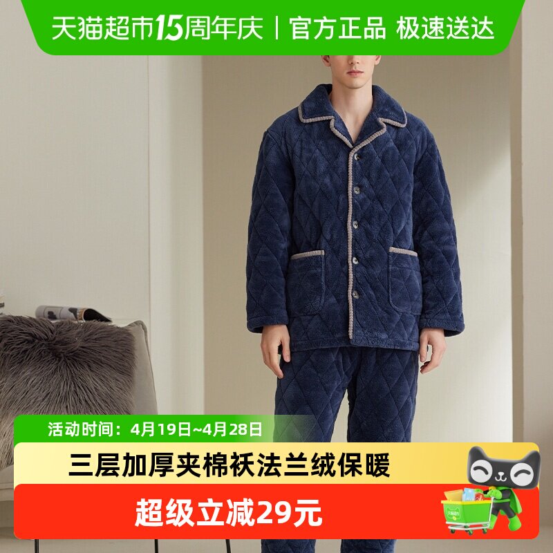珊瑚绒睡衣秋冬季加厚加绒三层夹棉袄套装款保暖家居服可外穿男士