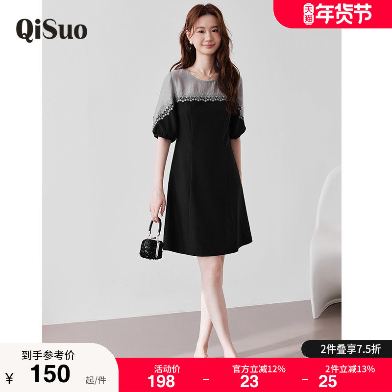 夏季新款女装赫本蕾丝拼接小黑裙性感显瘦短袖连衣裙大码A字伞裙
