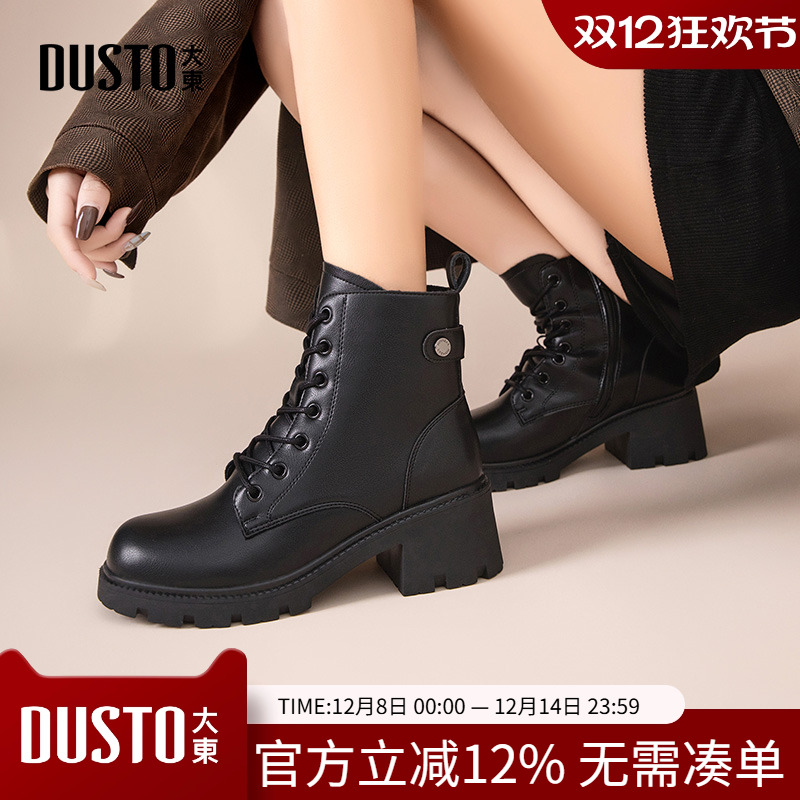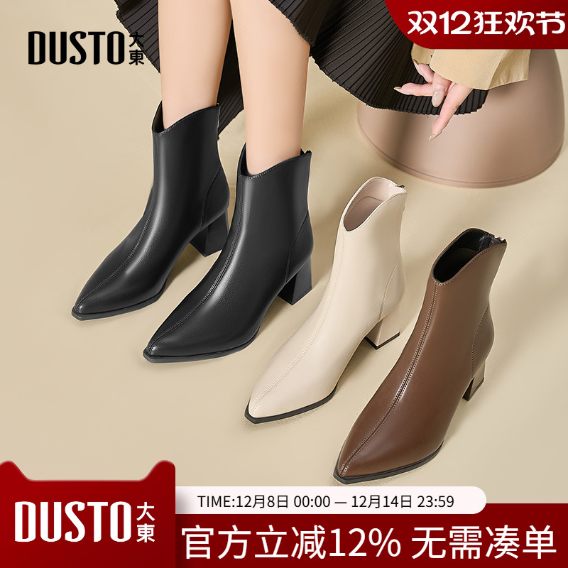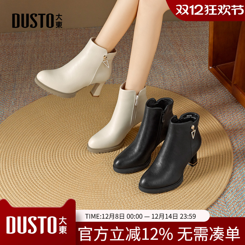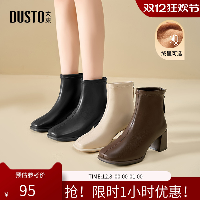 大东女靴2025冬季新款时尚粗跟女短靴高跟方头后拉链加绒保暖女鞋