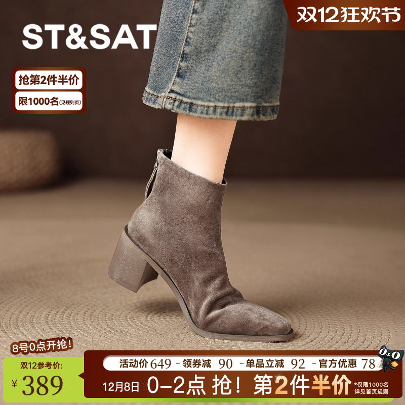 St&Sat/星期六高跟鞋女鞋秋冬款靴子冬季短靴25新款加绒粗跟靴子
