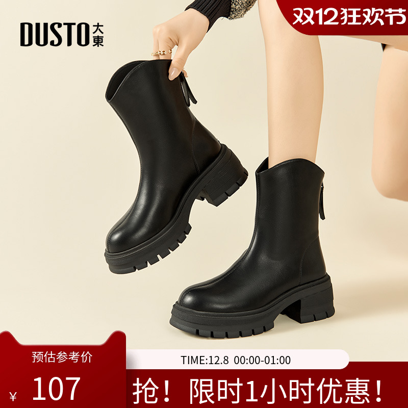 大东骑士靴女鞋2025冬季新款高跟粗跟圆头后拉链厚底小轻靴D1149A