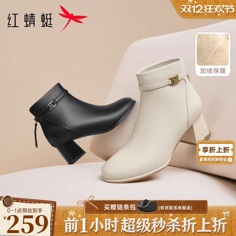 红蜻蜓高跟短靴女2025冬季女鞋白色粗跟女靴皮鞋加绒羊皮妈妈靴子