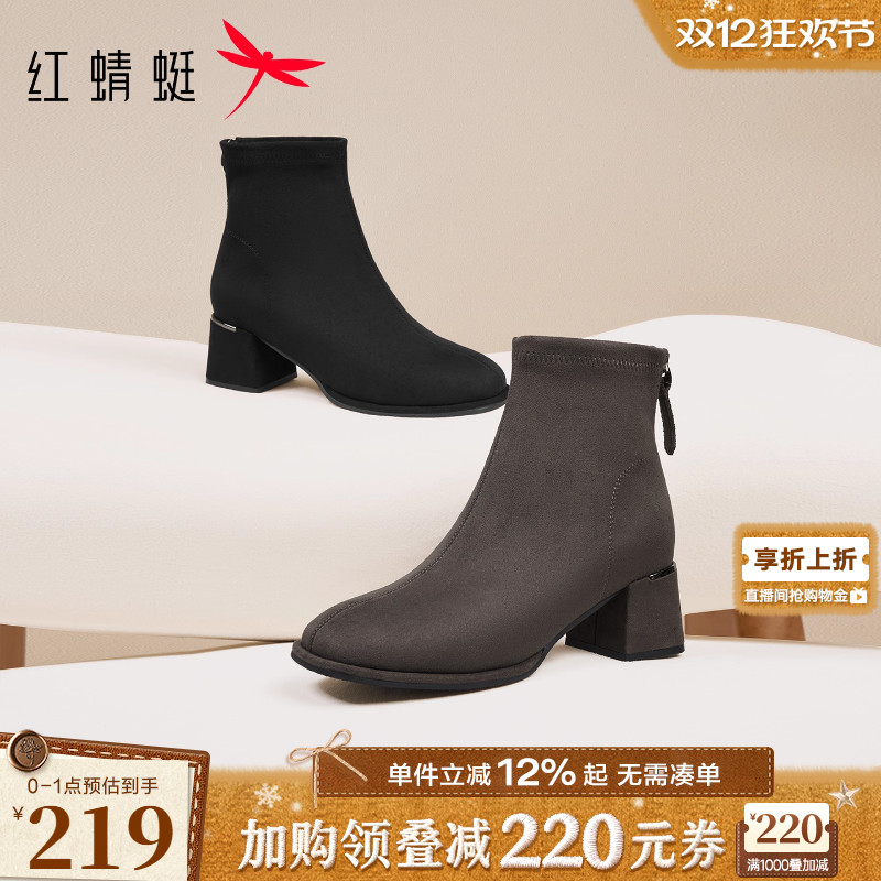 红蜻蜓弹力靴女2025冬季新款女靴粗跟黑色瘦瘦靴气质高跟女鞋短靴