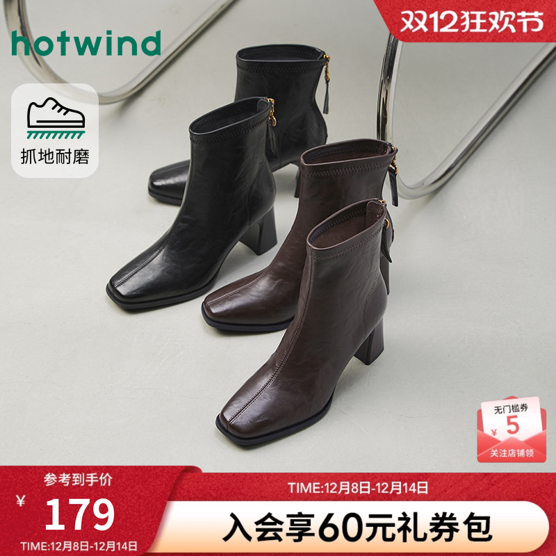 热风粗跟时装靴女2025年冬季新款黑色百搭短靴高跟通勤皮鞋女靴子