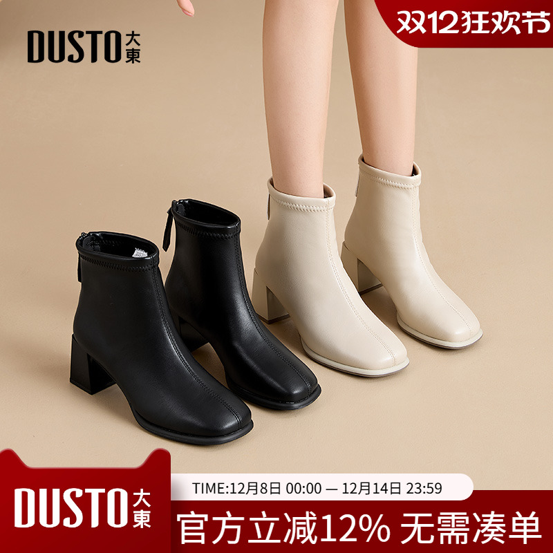 大东时装靴女鞋2025冬季新款休闲优雅粗跟后拉链方头高跟鞋0109A