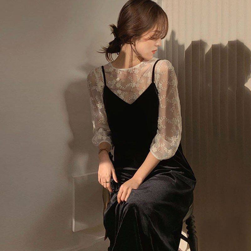2025春新款 连衣裙女中长款春夏黑色金丝绒吊带裙+蕾丝上衣两件套