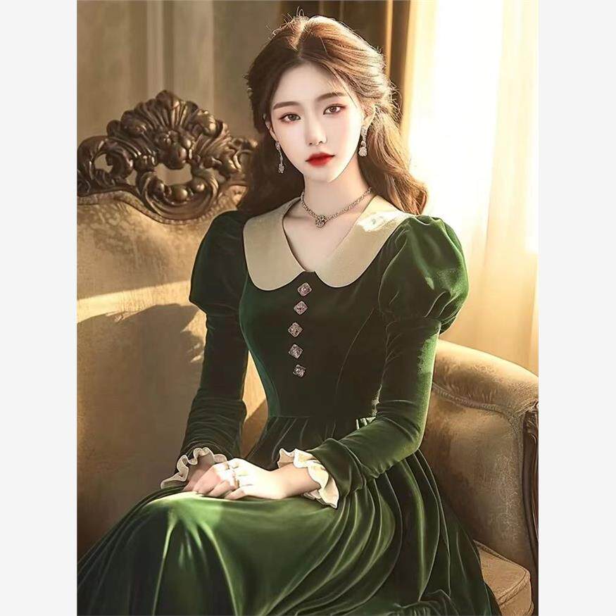 早秋新款独特别致法式赫本风正式场合高端精致绿色金丝绒连衣裙女