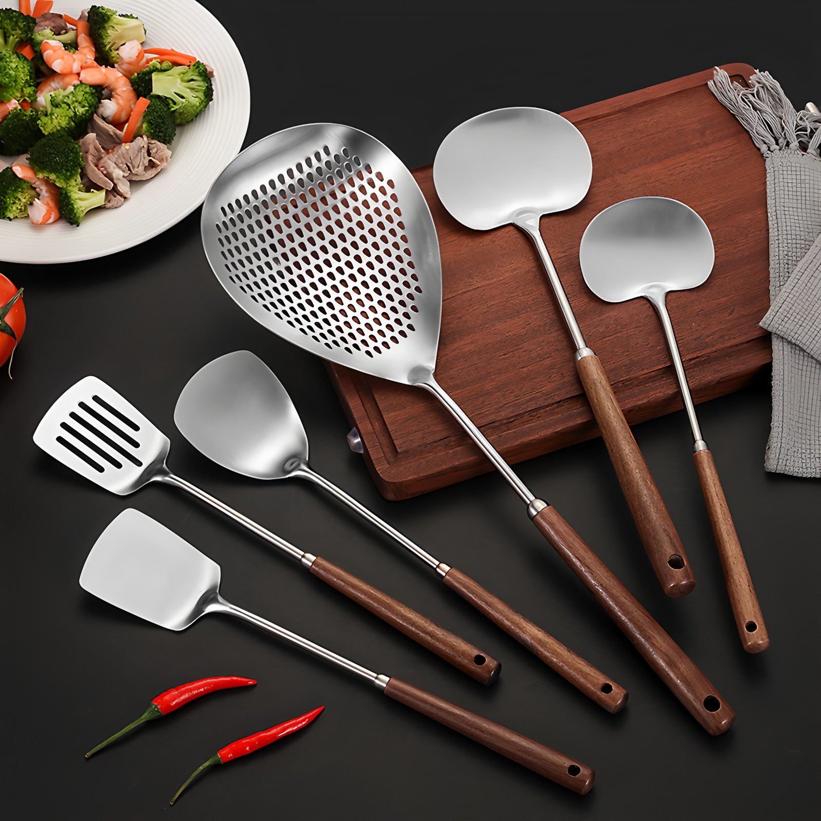 316不锈钢锅铲胡桃木蘑菇小锅铲厨房家用炒勺铁锅铲炒菜铲子套装
