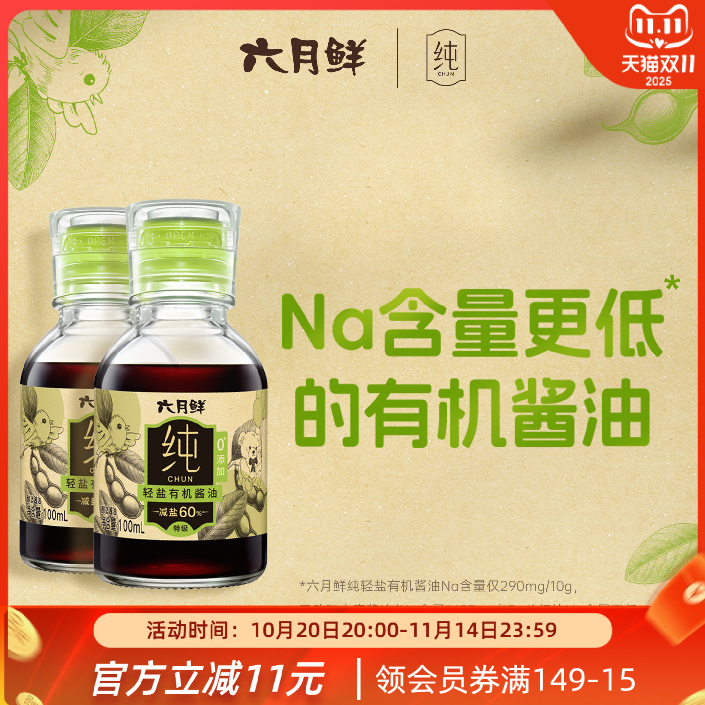【天猫U先】六月鲜·轻8克轻盐特级酿造生抽酱油280ml CRM