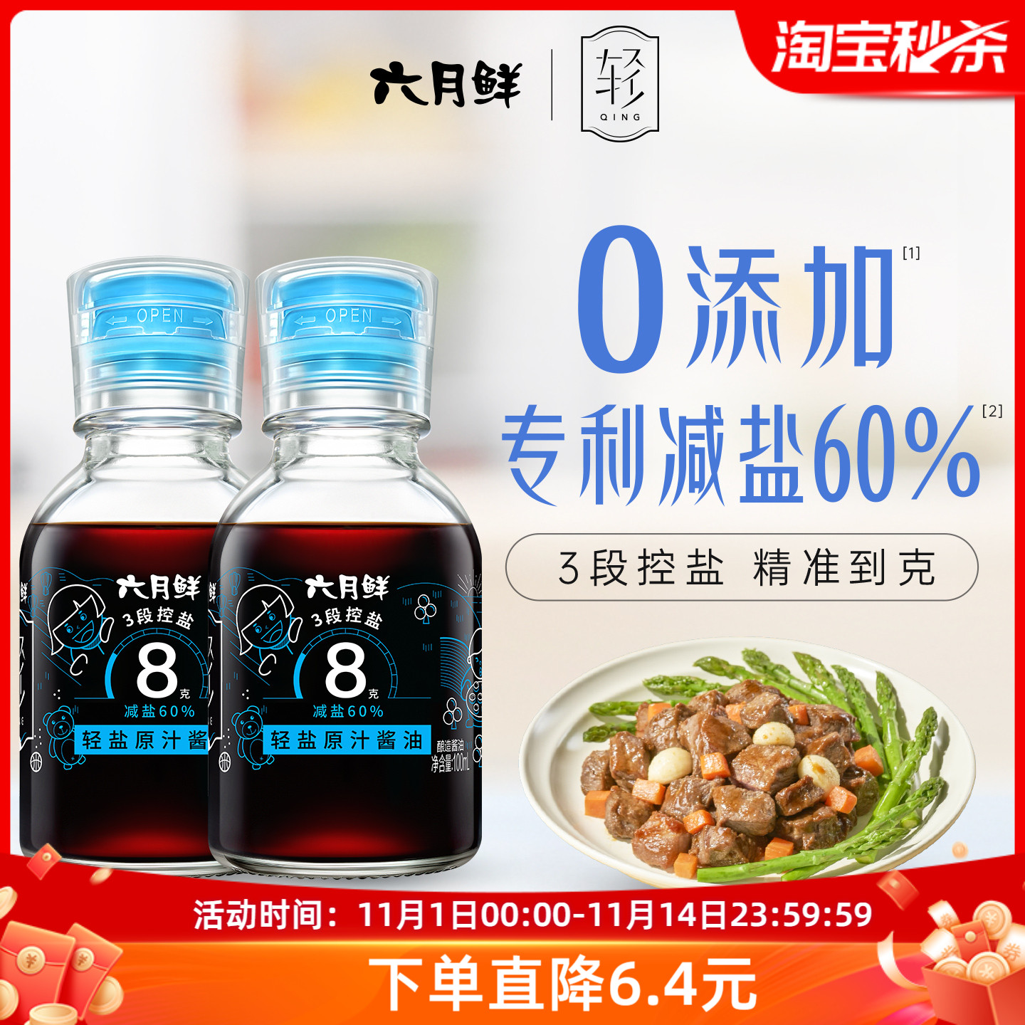 六月鲜8克轻盐酱油500mL*2瓶0%添加防腐剂生抽减盐炒菜凉拌家用