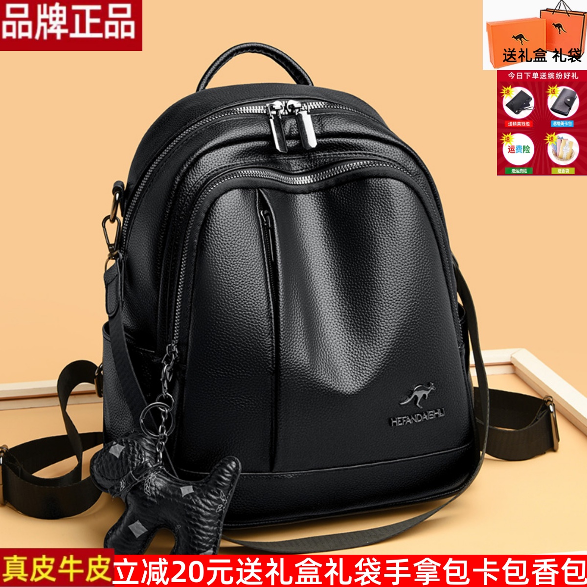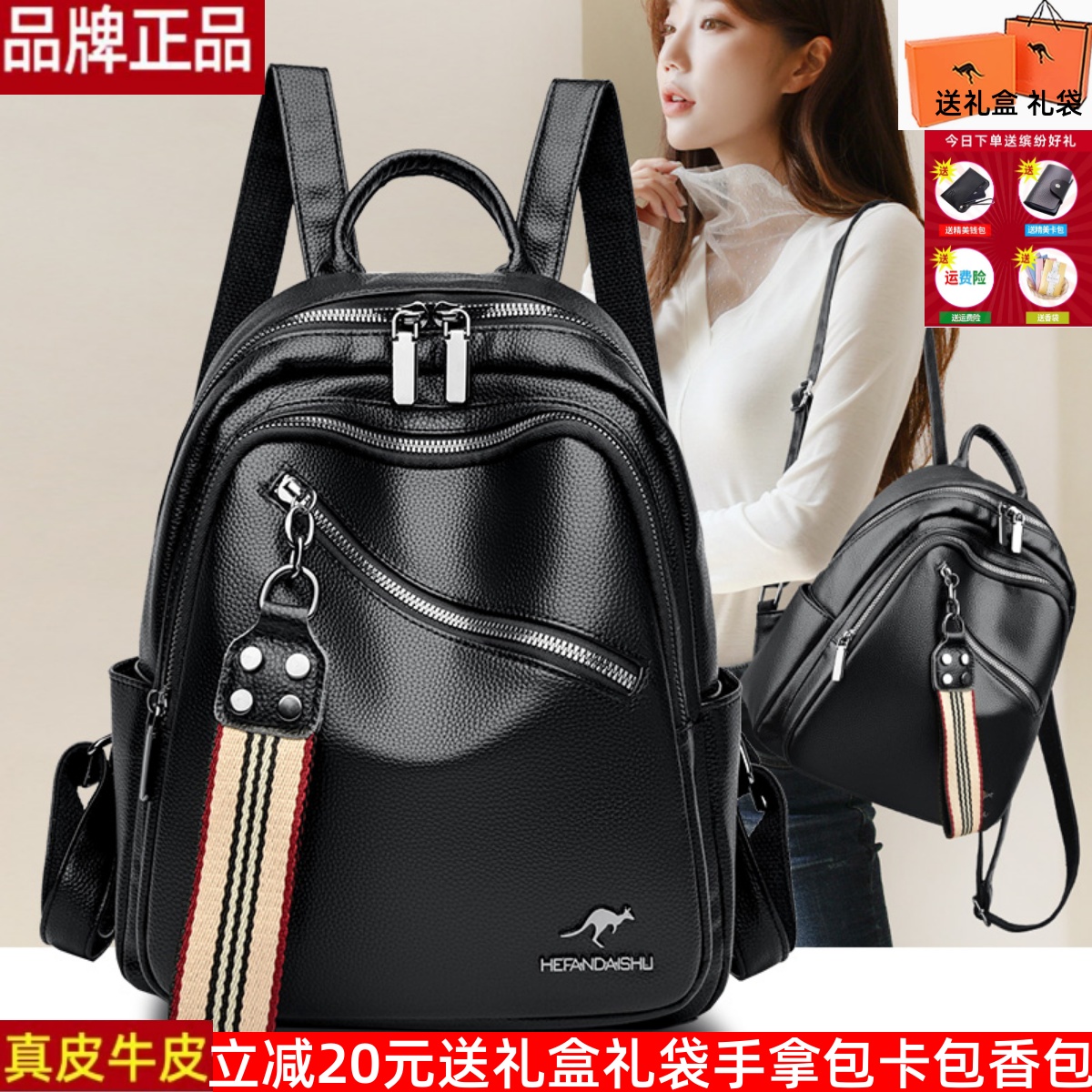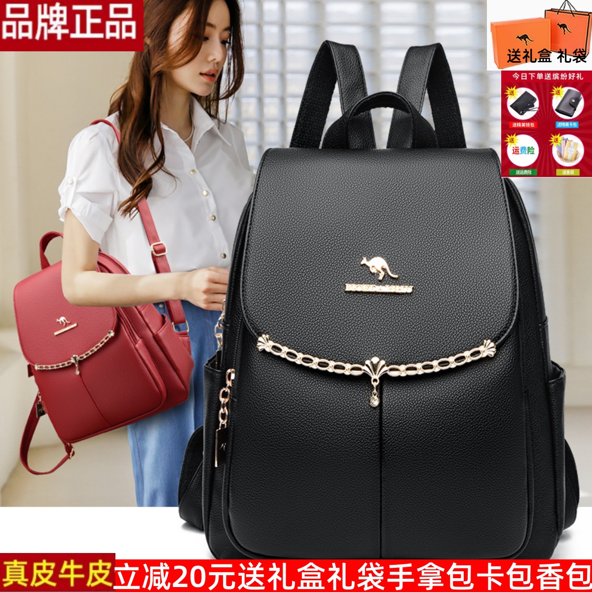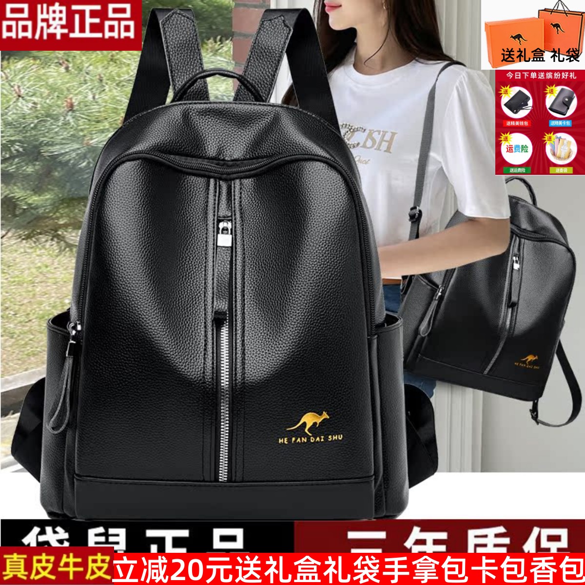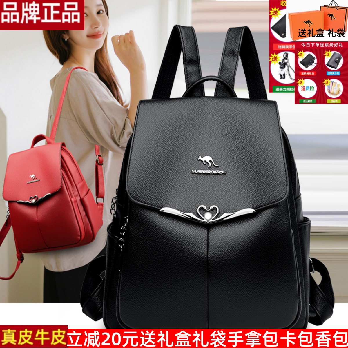 正品袋鼠真皮双肩包女2025新款旅行大容量女包软牛皮背包休闲百搭