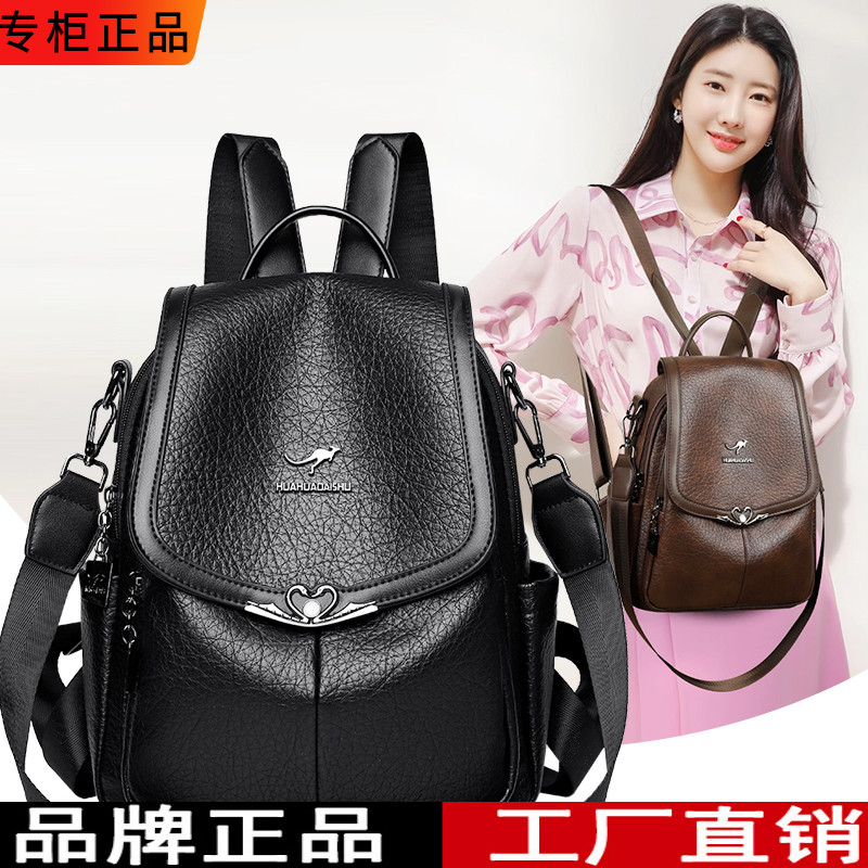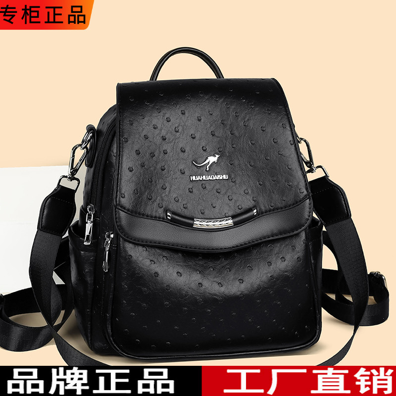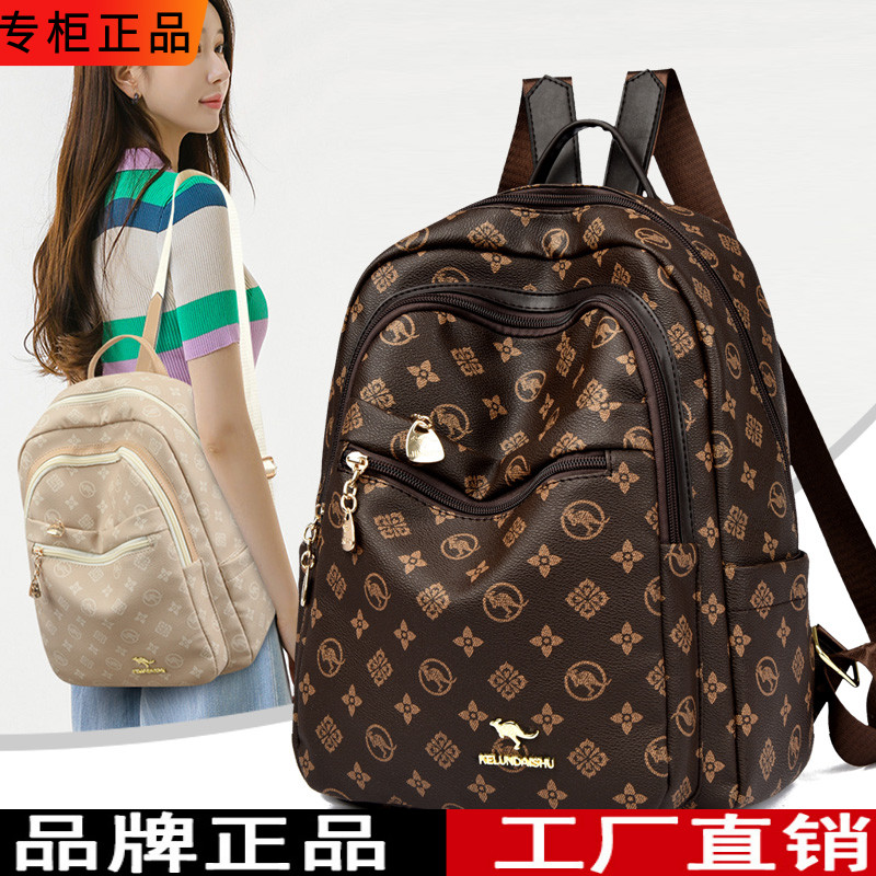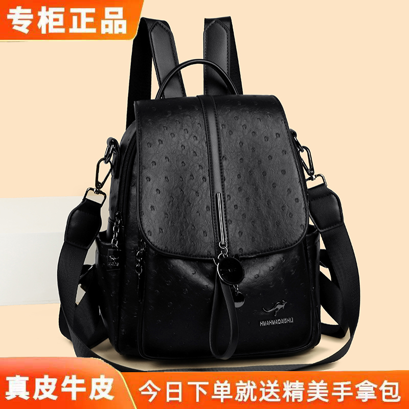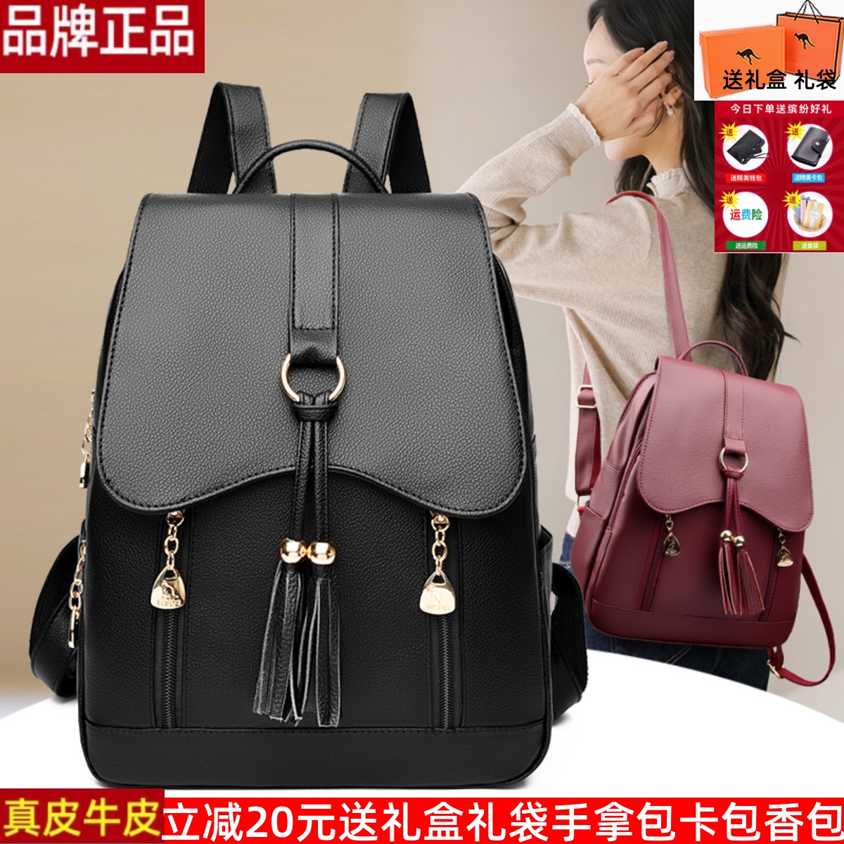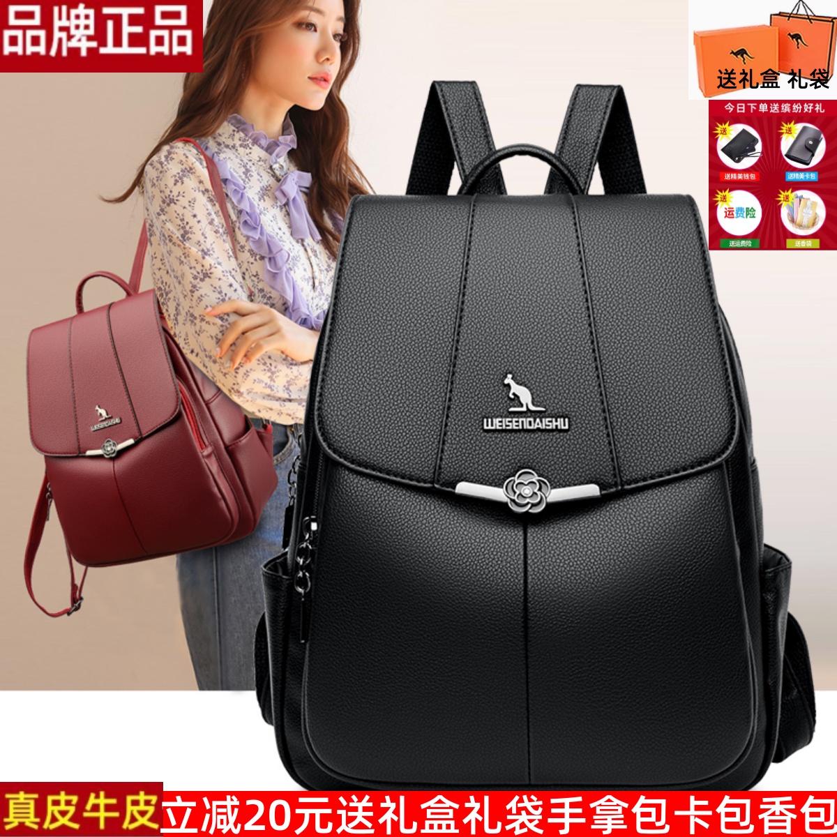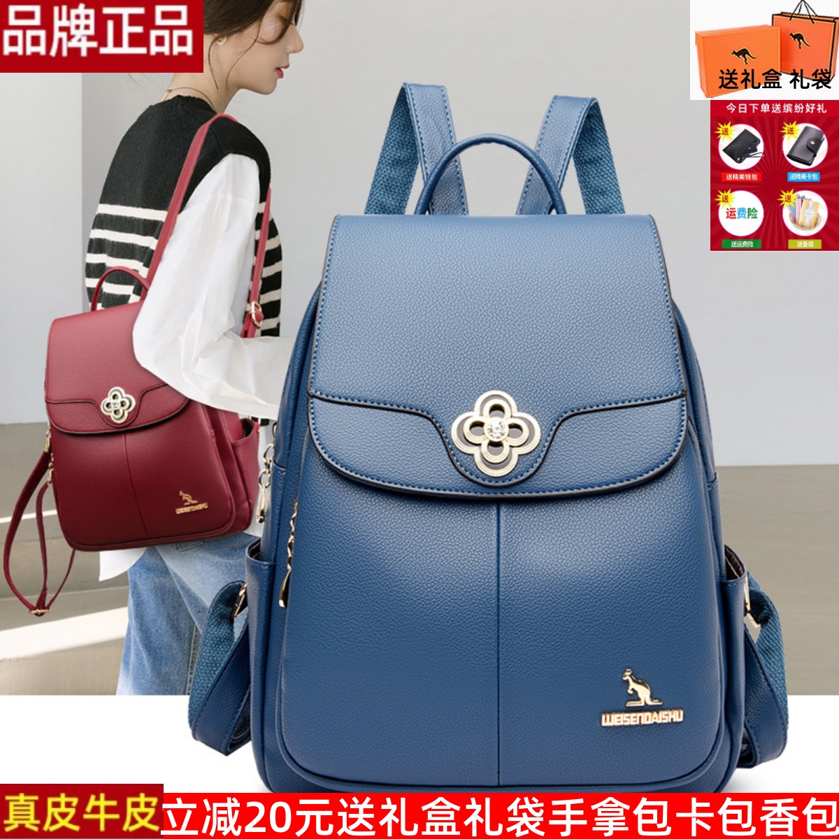 正品袋鼠真皮双肩包女2025新款旅行大容量女包软牛皮背包休闲百搭