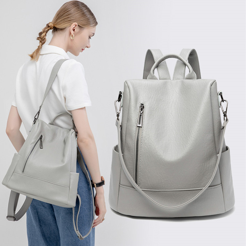 头层牛皮双肩背包荔枝纹多拉链大容量真皮软皮多功能时尚单肩女包