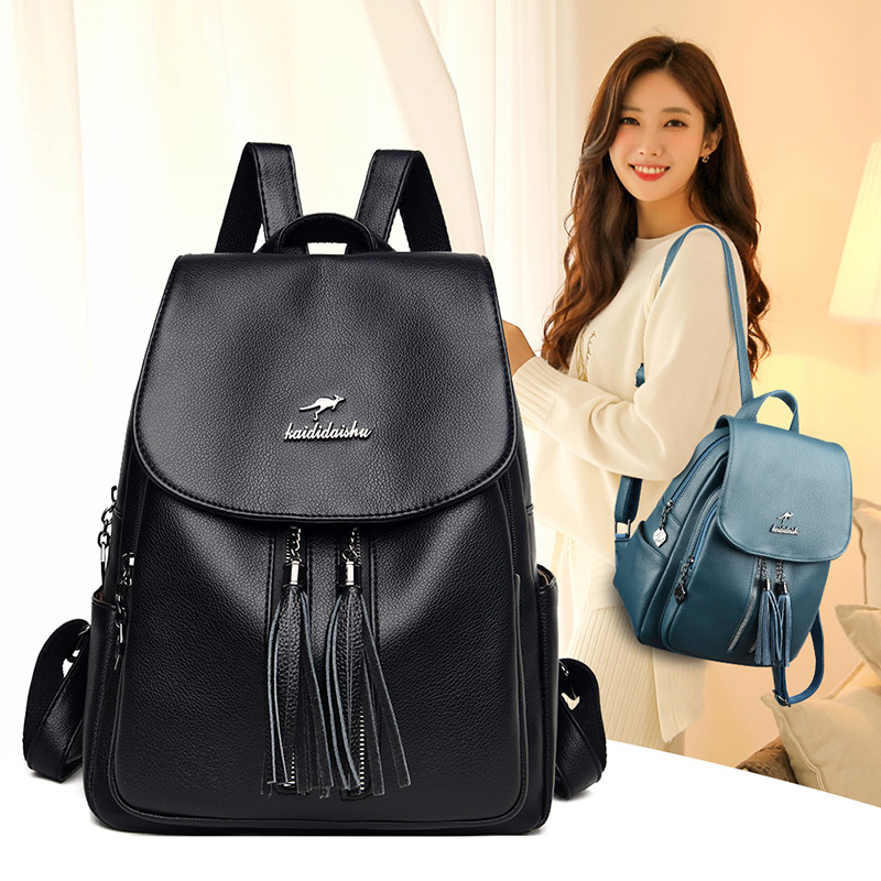 威森袋鼠真皮牛皮双肩包女包2025新款气质通勤大容量旅行流苏背包