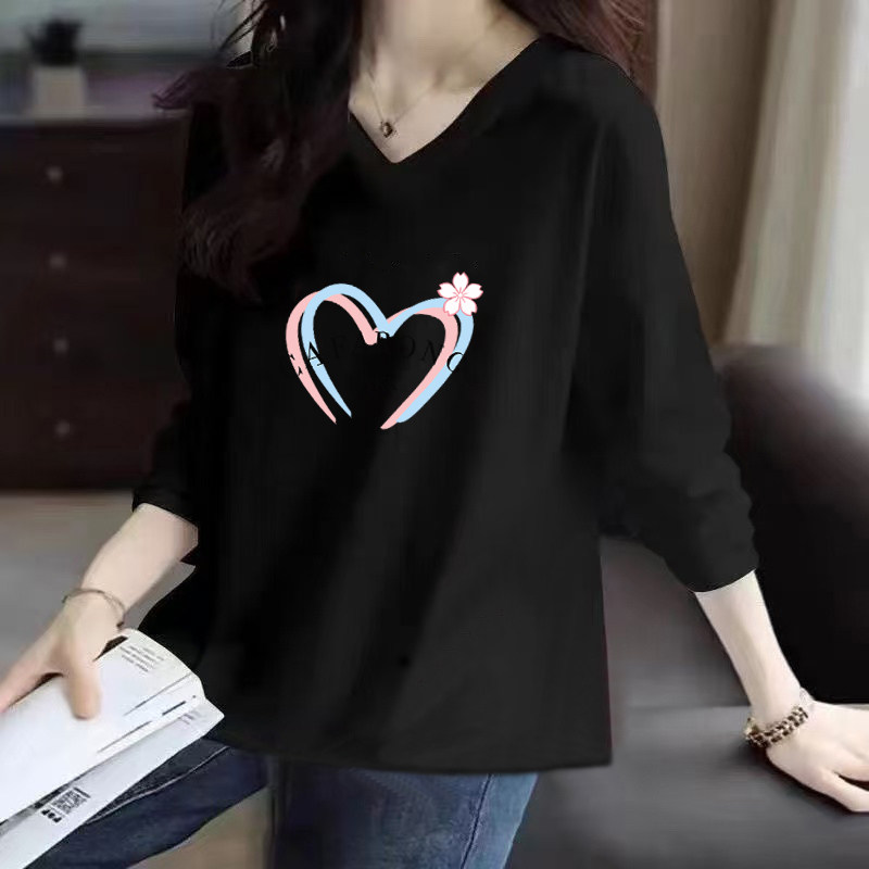纯棉长袖T恤女韩版宽松大码女装2025春秋新款v领上衣体恤衫女潮