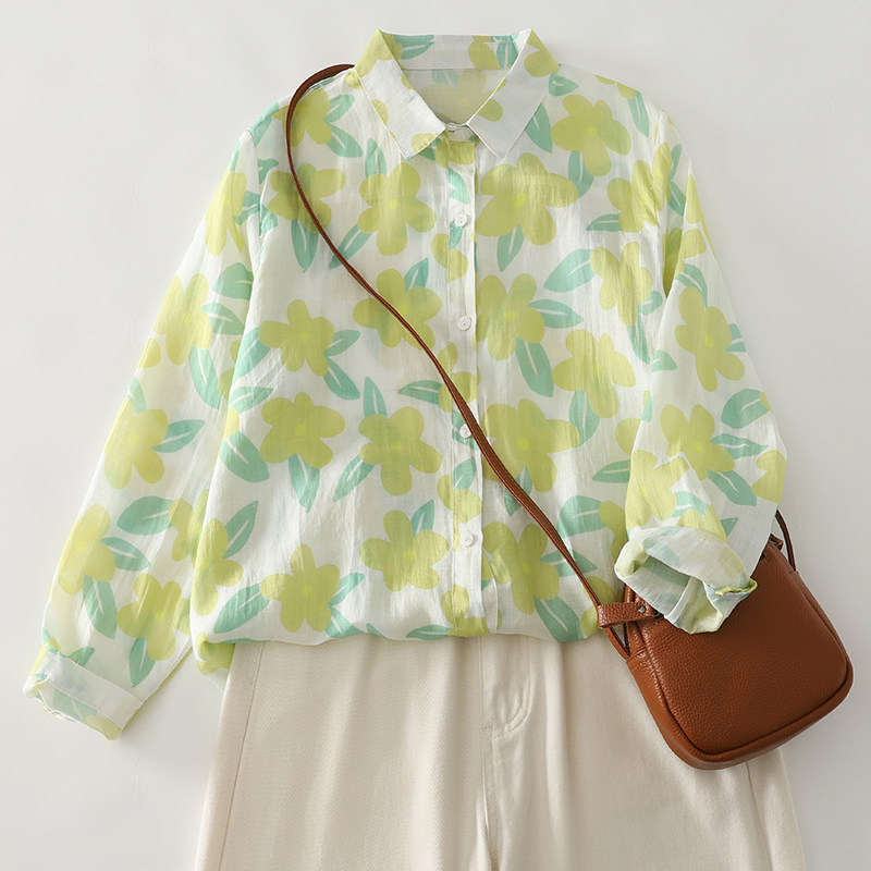 洋气减龄宽松棉麻衬衫女春夏季时尚复古印花衬衣百搭薄款长袖上衣