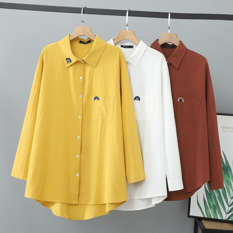 胖mm女装夏装绣花中长款衬衫女遮肉200斤长袖大码显瘦棉麻上衣