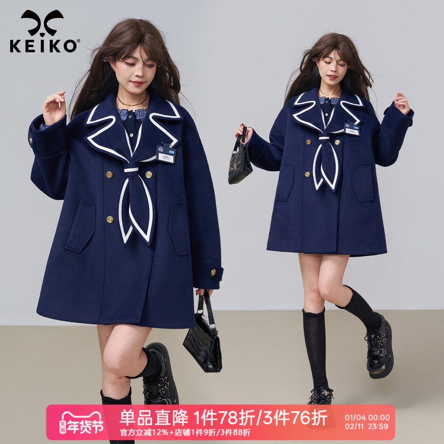 KEIKO 高级感海军领毛呢外套女秋冬学院风斗篷型双排扣呢子大衣