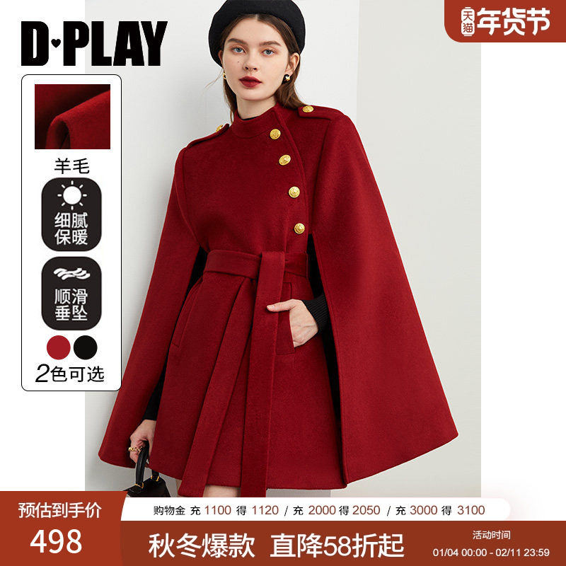 DPLAY2025年冬季气质复古红色斗篷大衣羊毛呢子大衣结婚外套女