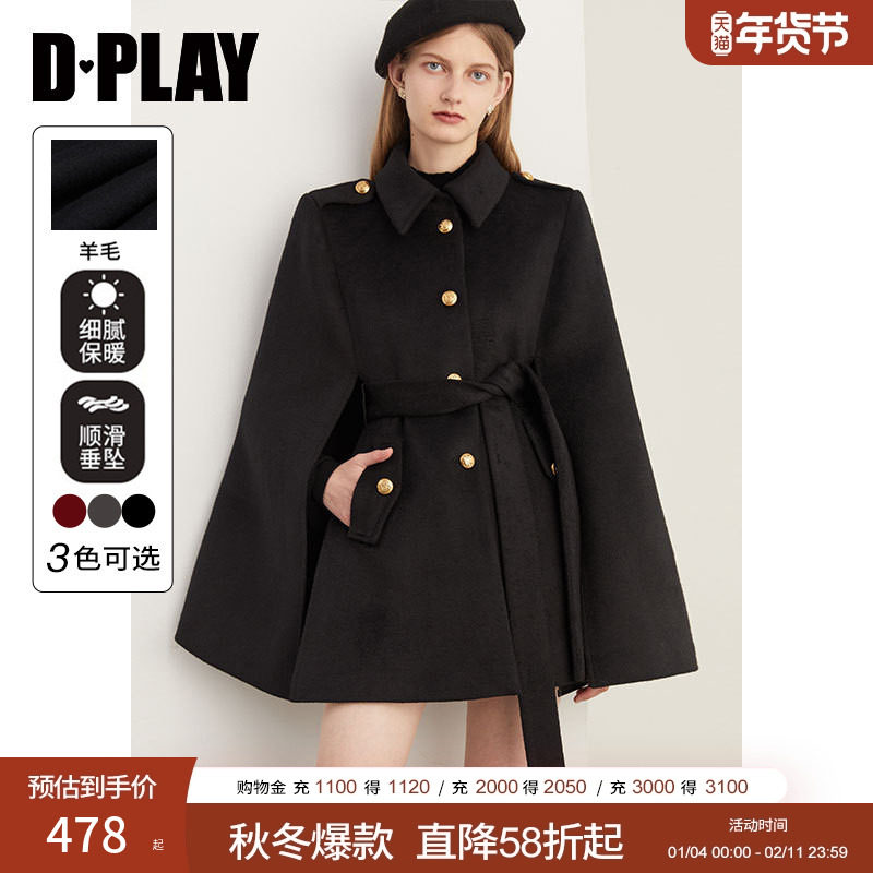 DPLAY2025冬季新款气质法式黑色斗篷大衣英伦风呢子大衣外套女